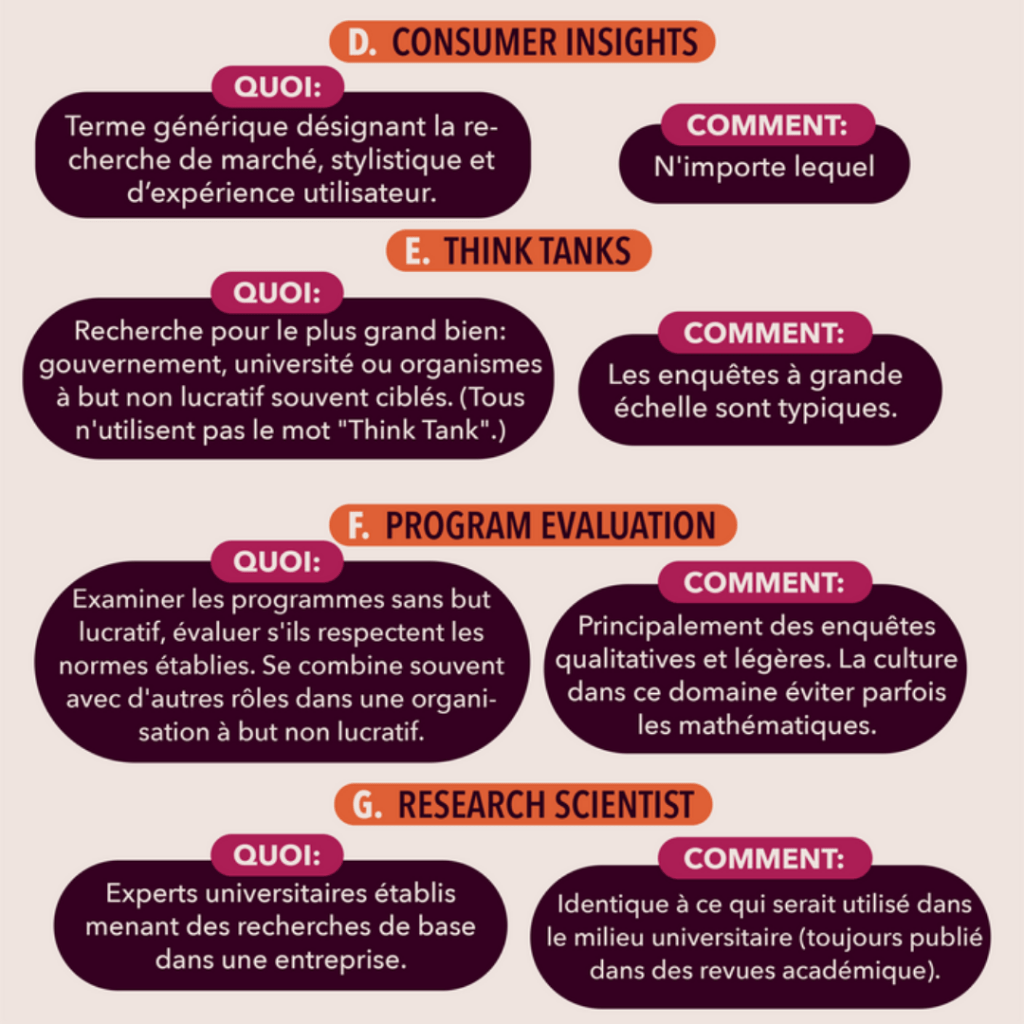 | Évaluation du programme (Program Evaluation) | Examiner les programmes sans but lucratif, évaluer s’ils respectent les normes établies. Se combine souvent avec d’autres rôles dans une organisation à but non lucratif. | Principalement des enquêtes qualitatives et légères. La culture dans ce domaine éviter parfois les mathématiques. |
