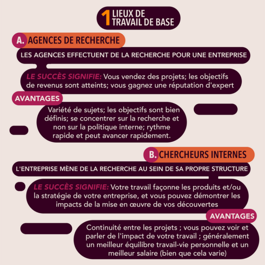 | À quoi ressemble le succès? | Vous vendez des projets ; les objectifs de revenus sont atteints ; vous gagnez une réputation d’expert de l’industrie. | Votre travail façonne les produits et/ou la stratégie de votre entreprise, et vous pouvez démontrer les impacts de la mise en œuvre de vos découvertes. |
