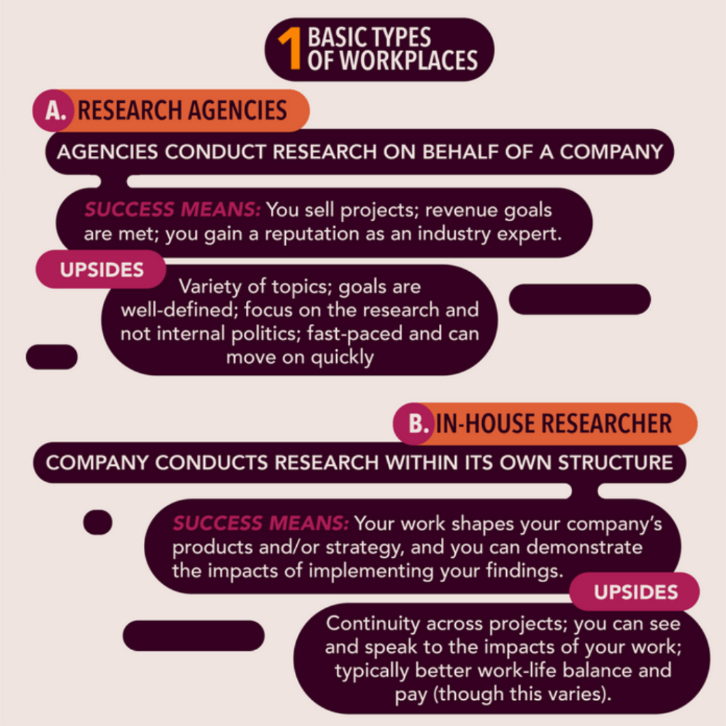 | What does success look like? | You sell projects; revenue goals are met; you gain a reputation as an industry expert | Your work shapes your company’s products and/or strategy, and you can demonstrate the impacts of implementing your findings. |