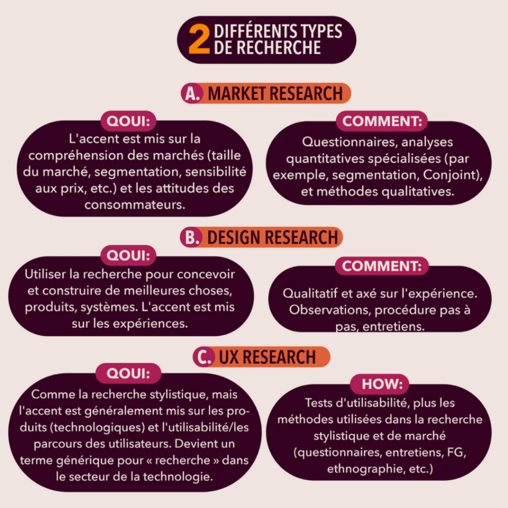 | Recherche d’expérience utilisateur (UX Research) | Comme la recherche stylistique, mais l’accent est généralement mis sur les produits (technologiques) et l’utilisabilité/les parcours des utilisateurs. Devient un terme générique pour « recherche » dans le secteur de la technologie. | Tests d’utilisabilité, plus les méthodes utilisées dans la recherche stylistique et de marché (questionnaires, entretiens, FG, ethnographie, etc.) |