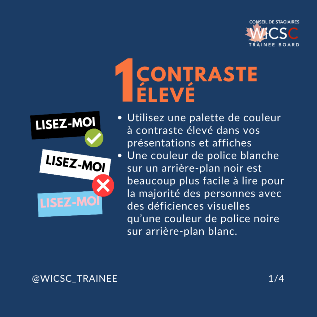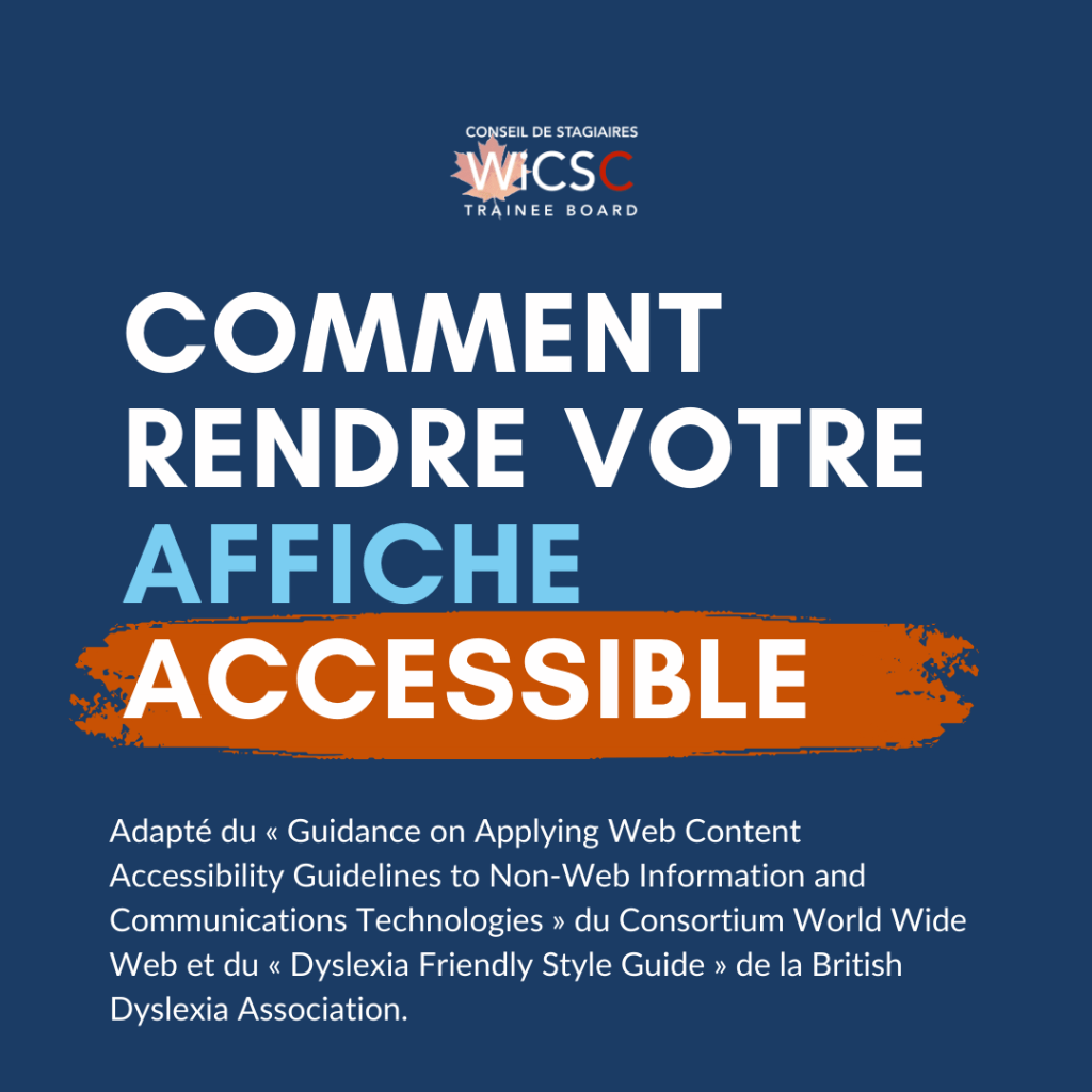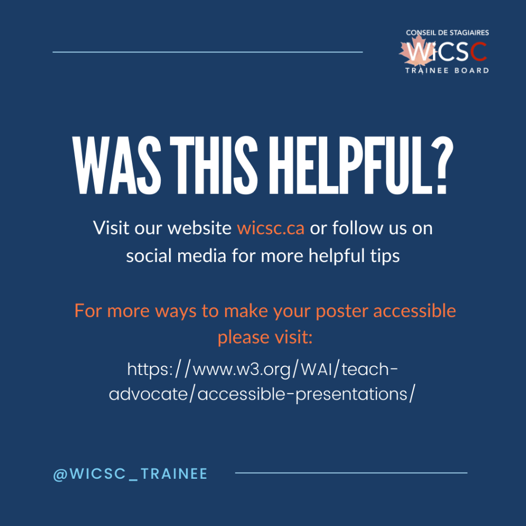 Est-ce que ceci vous a été utile? Visitez notre site wicsc.ca ou suivez-nous sur les réseaux sociaux pour plus de conseils. Pour plus de façons de rendre votre affiche accessible, veuillez visiter: https://www.w3.org/WAI/teach-advocate/accessible-presentations/