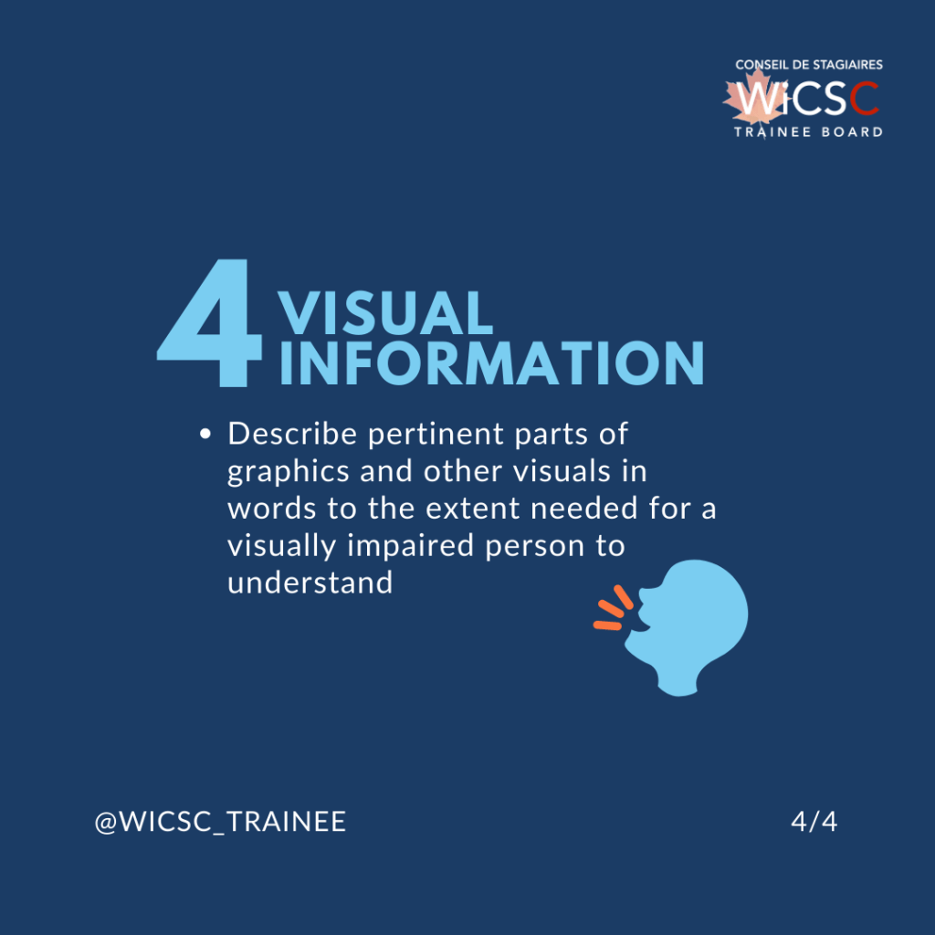 Dscribe pertinent parts of graphics, videos, and other visuals to the extent needed to understand the presentation by someone who is visually impaired.