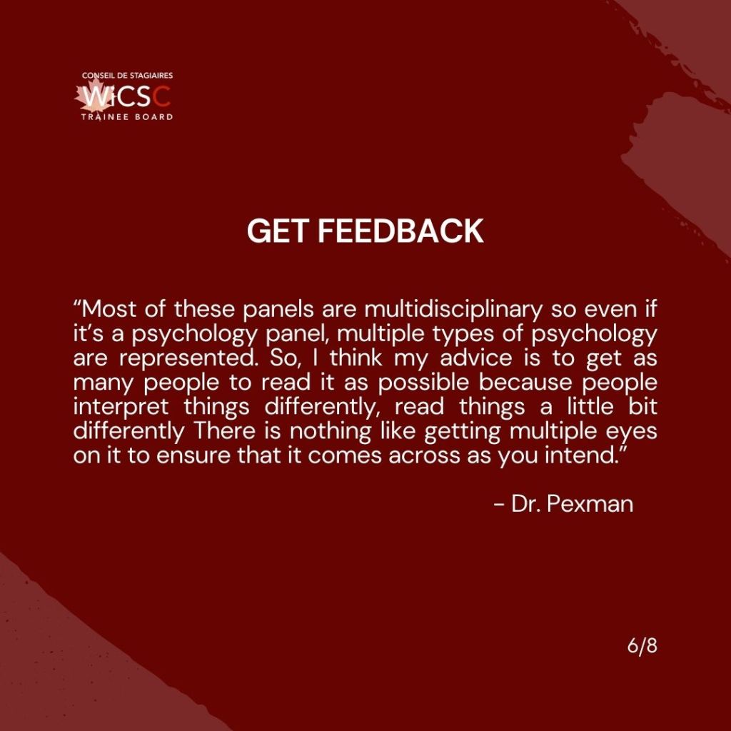 While your application may be developed and written by yourself, one common misconception is that one cannot receive feedback on an application from colleagues or supervisors. In fact, feedback is an important stage of the grant writing process. Dr. Pexman advises, “Most of these panels are multidisciplinary so even if it’s a psychology panel, multiple types of psychology are represented. So, I think my advice is to get as many people to read it as possible because people interpret things differently, read things a little bit differently There is nothing like getting multiple eyes on it to ensure that it comes across as you intend.” People that can provide feedback on your application include professors in your department, your supervisor(s), colleagues from your lab, or even friends and family. While not every suggestion needs to be incorporated, having a broad perspective on your work should allow you to identify emergent themes in the suggestions made by others. These can help you improve your writing to a wide audience.