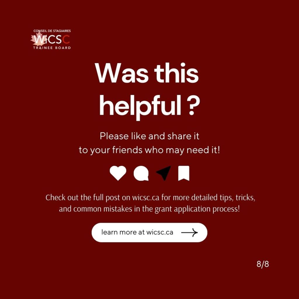 It’s our hope at WICSC+ that this blog post will help guide your grant applications this season to fruition. If you found this post helpful, please share it or its accompanying social media post on your social media of choice. We also encourage you to share this post by email with any students in your lab who may be applying for grants this season. You can find us on X @wicscanada or Instagram @wicsc_trainee. We offer a special thanks to our panelists, Dr. Penny Pexman, Dr. Karl Spuznar, and Dr. Ryan Yeung, as well as CSBBCS 2023 for hosting the panel that provided us with their insights.