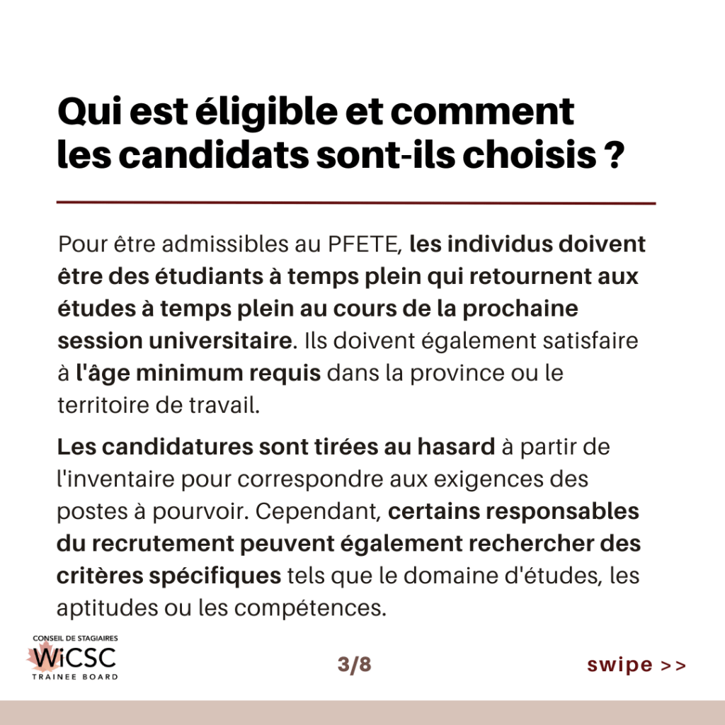 To be eligible for FSWEP, individuals must be full-time students returning to full-time studies in the next academic term. They also have to meet the minimum age requirement in the province/territory of work.