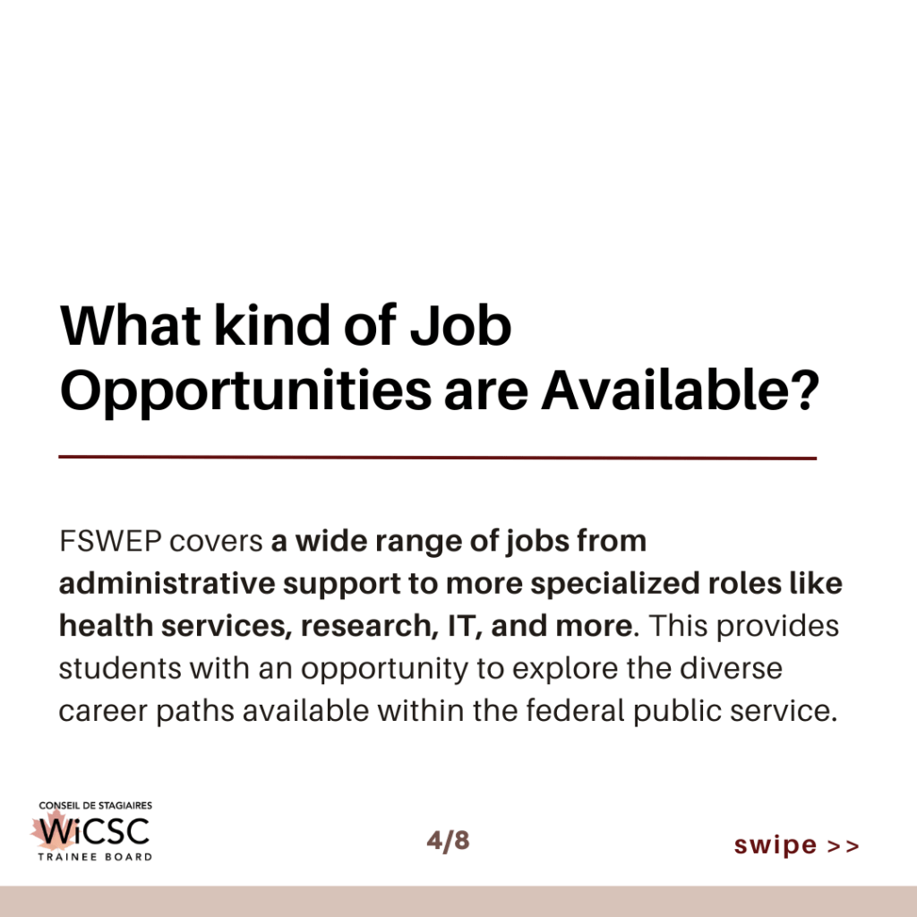 FSWEP covers a wide range of jobs from administrative support to more specialized roles like health services, research, IT, and more. This provides students with an opportunity to explore the diverse career paths available within the federal public service.