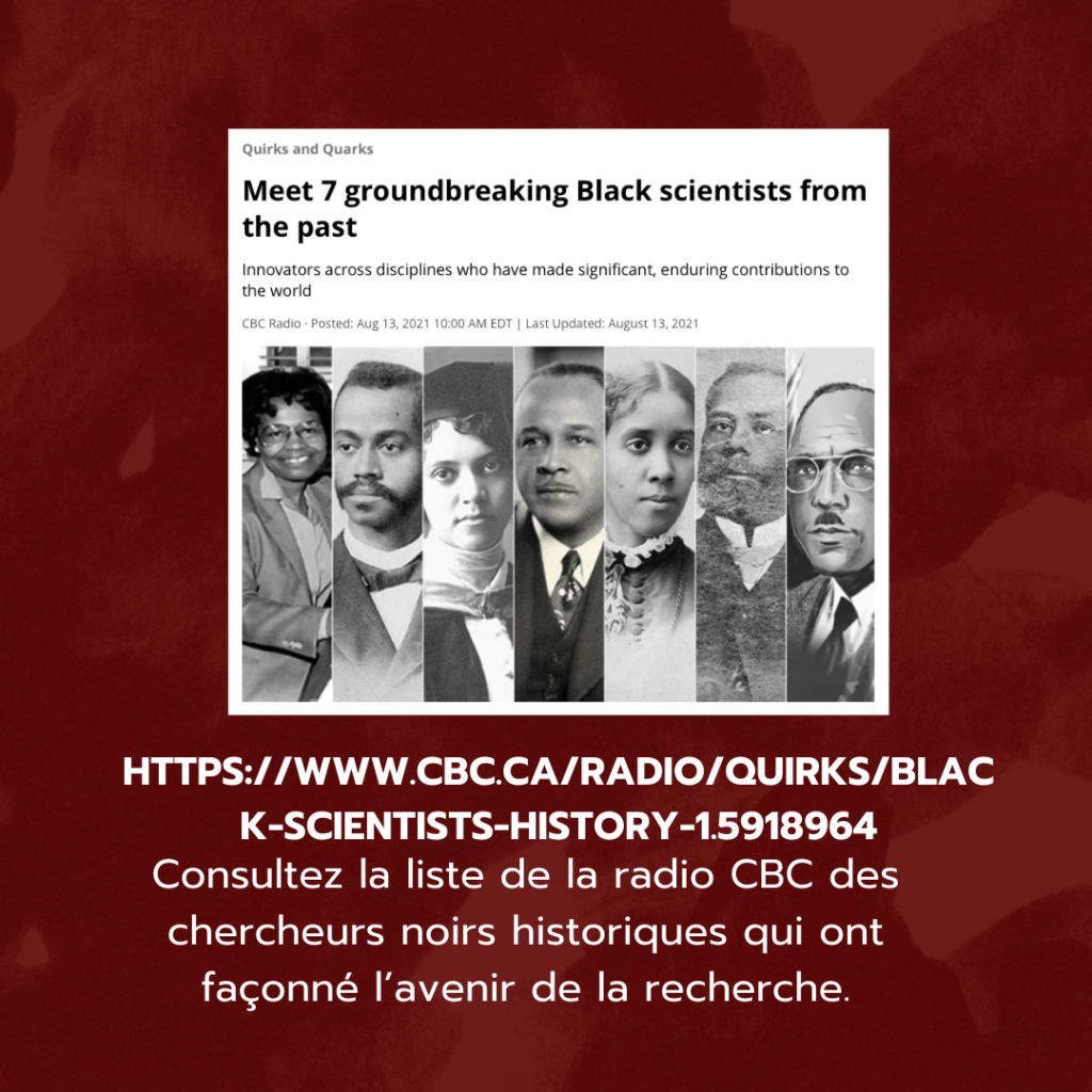 En 2021, CBC a également publié un article sur des chercheurs noirs historiques qui ont façonné l’avenir de la recherche (https://www.cbc.ca/radio/quirks/black-scientists-history-1.5918964) avec des liens supplémentaires vers leurs histoires. De nombreux événements ont également lieu partout au Canada, et nous espérons que vous vous joindrez à nous pour célébrer le Mois de l’histoire des Noirs !