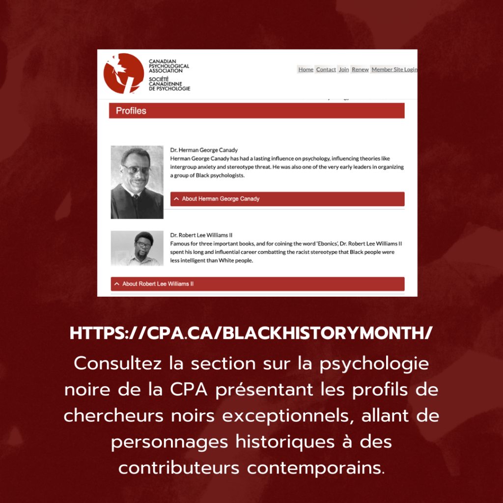 Vous pouvez également consulter la section de psychologie noire de l’ACP (https://cpa.ca/fr/blackhistorymonth/présentant des profils de chercheurs noirs exceptionnels, allant de figures historiques à des contributeurs contemporains.