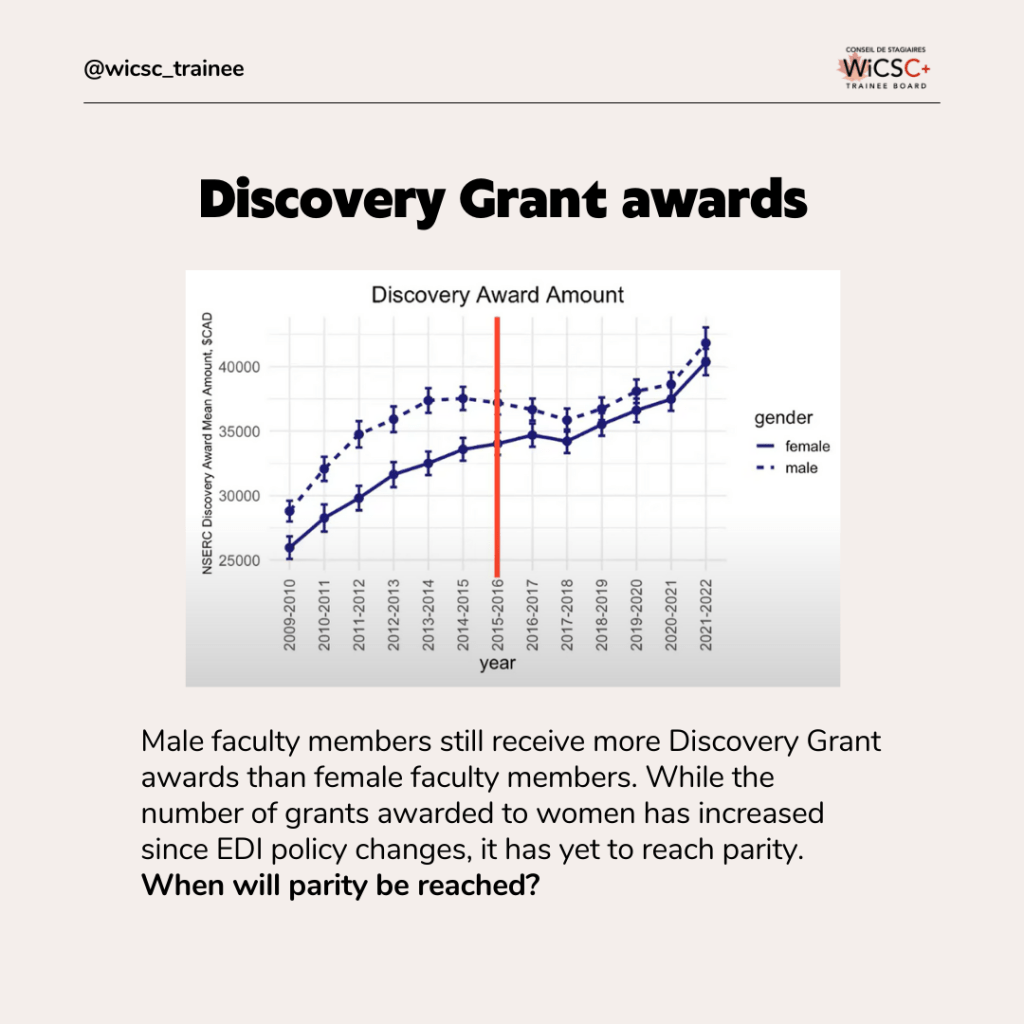 In sum, while parity has been promoted at some levels of grant reception by NSERC EDI initiatives, non-early career female researchers remain disadvantaged. Thus, future EDI initiatives implemented by NSERC ought to take this gender gap into consideration and make moves towards repairing it. This Women’s History Month, we at the WICSC+ trainee board encourage you to show your appreciation towards the non-early career female faculty members in your life. While it is no replacement for appropriate financial compensation, letting such an academic in your life know what a positive influence she has had on you and your scholarship could (at the very least) brighten her day. If you found this post interesting, please share it or its accompanying social media post on your social media of choice. You can find us on X or Instagram @wicsc_trainee.