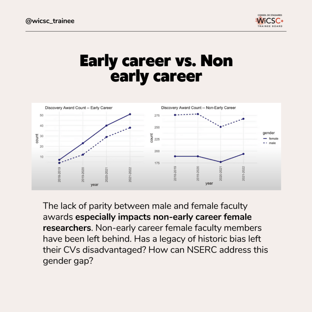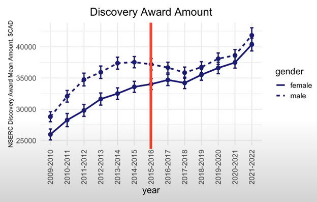 As these data demonstrate, Yang stated that the lack of parity between male and female faculty awards especially impacts non-early career female researchers. Yang proposed that this finding, along with the findings at the student level, indicate that EDI changes implemented by NSERC have been more effective at increasing the number of female students and early career researchers who receive funding, but have left female non-early career researchers behind. This may be due to non-early career female researchers having been historically denied funding to a greater degree throughout their careers, leaving their CVs with grant histories which selection committees may disadvantage in their choices.