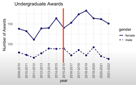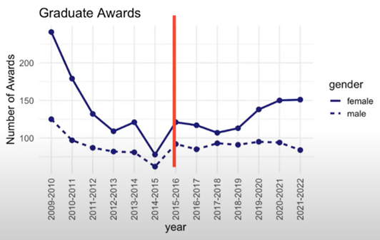 Yang went on to describe the data at the postdoctoral level. For postdocs, we again see the trend in previous years indicating more women than men receiving grants, with growth for women from 2016-2017 to 2019-2020 and a drop for men from 2016-2017 to 2017-2018. However, from 2020-2021 onwards, an equal number of women and men received NSERC postdoctoral fellowships, indicating parity.