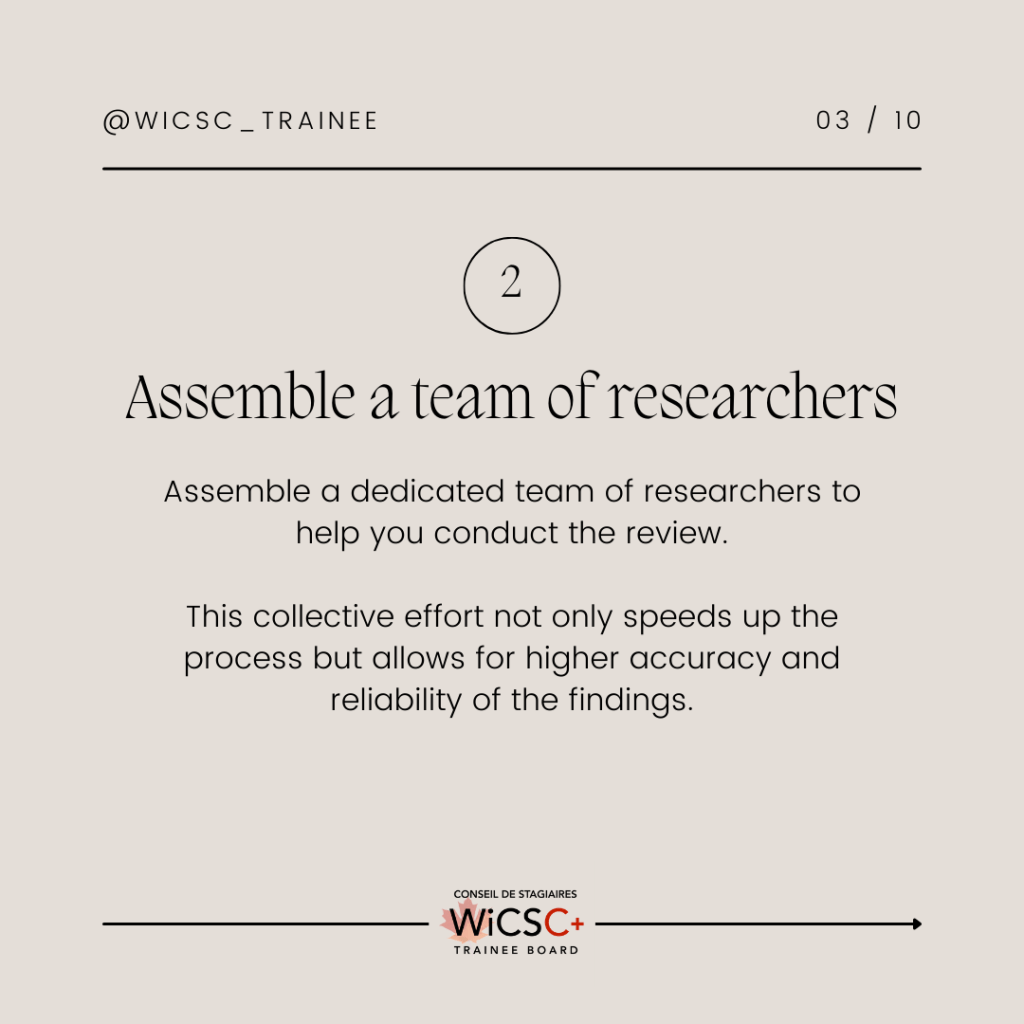 Assemble a dedicated team of researchers to help you conduct the review. This collective effort not only speeds up the process but allows for higher accuracy and reliability of the findings. Having a team is critical for assessing inter-rater reliability, a key aspect in ensuring consistency and agreement among team members when evaluating and selecting articles or information to be included in the review.