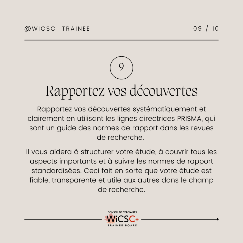 Rapportez vos découvertes systématiquement et clairement en utilisant les lignes directrices PRISMA, qui servent d’un guide des normes de rapport pour les revues de la recherche. Elles vous aideront à structurer votre étude ; en les suivant, vous pouvez vous assurer que vous n’oubliez aucun aspect important et que vous suivez les normes de rapport standardisées. Ceci fait en sorte que votre étude est fiable, transparente et utile aux autres dans le champ de recherche.
