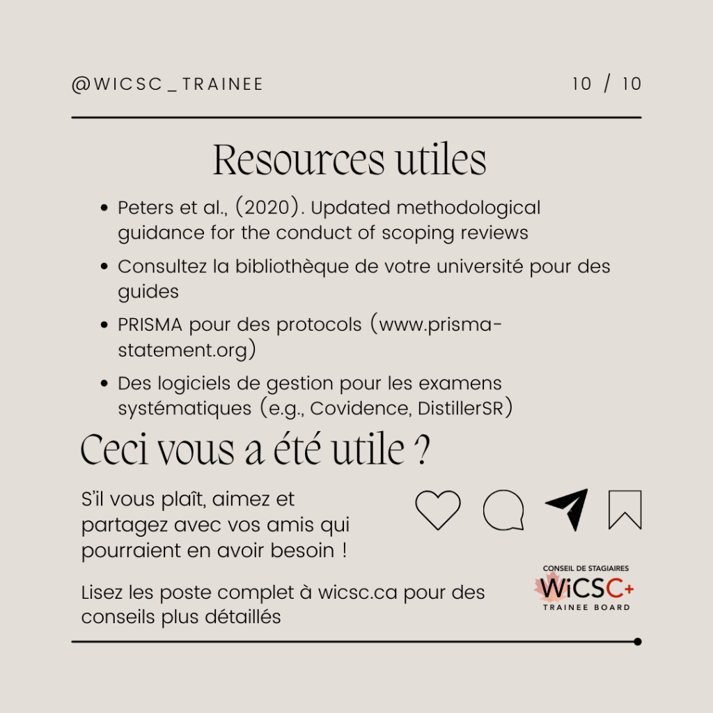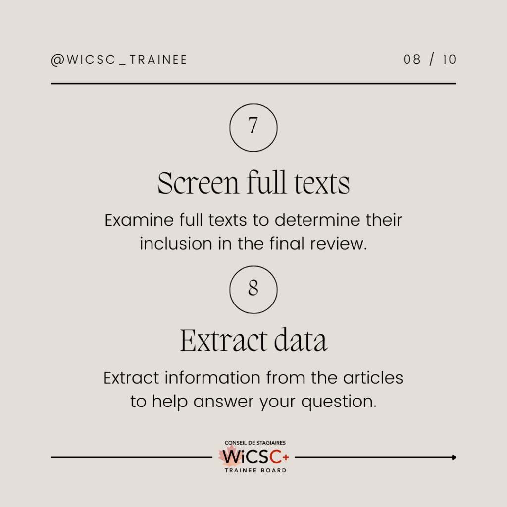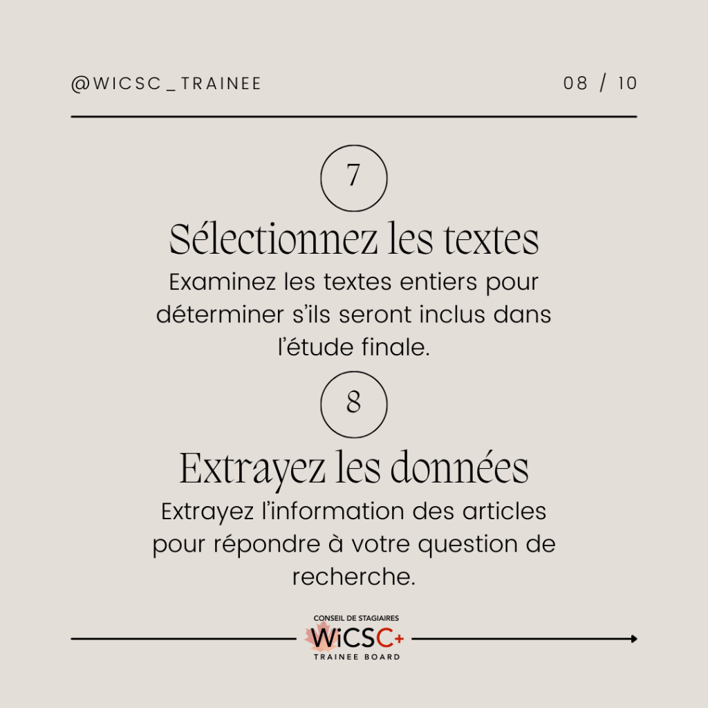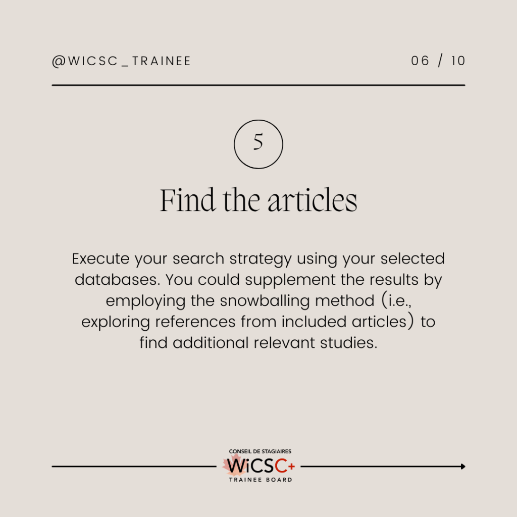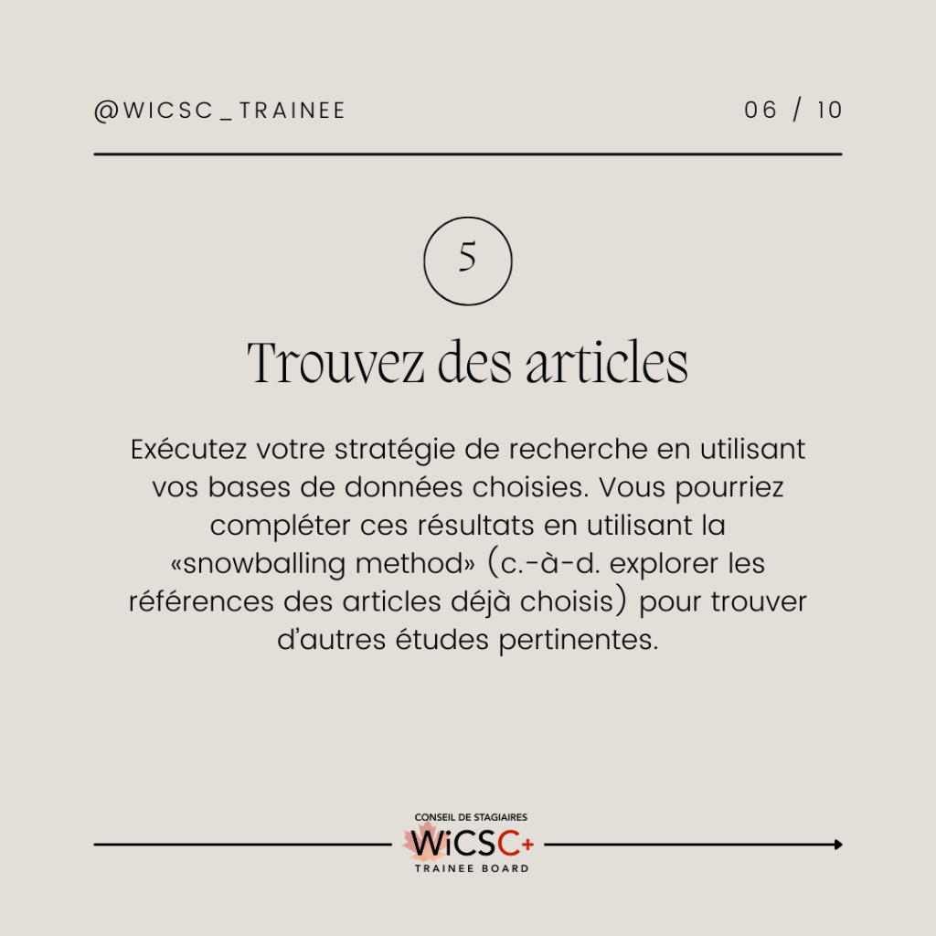 Récupérez des articles en utilisant vos bases de données choisies. Vous pourriez compléter ces résultats en utilisant la «snowballing method» (qui consiste à explorer les références des articles déjà choisis) pour trouver d’autres études pertinentes. L’organisation des articles récupérés peut être facilitée par des logiciels de gestion pour les examens systématiques tels que Covidence ou DistillerSR, ou en utilisant des feuilles de calcul comme Excel ou Google Sheets. L’utilisation des logiciels comme Covidence est avantageux parce qu’ils ont des fonctions additionnelles, telles que la sélection et l’enlèvement automatique des articles en double. Cependant, il est important de noter que certains logiciels spécialisés peuvent nécessiter un abonnement.
