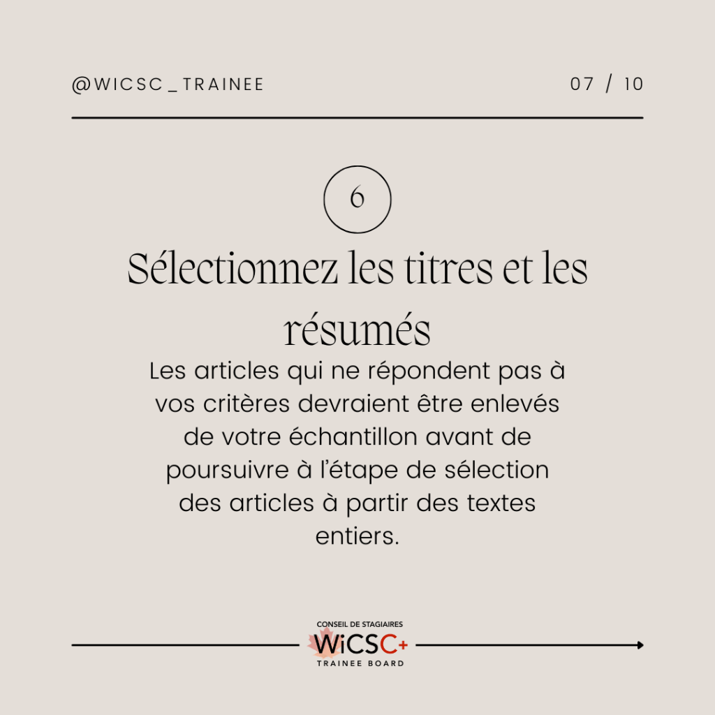 Présélectionnez les titres et les résumés pour déterminer si les articles répondent à vos critères d’inclusion. Les articles qui n’y répondent pas devraient être enlevés de votre échantillon avant de poursuivre à la prochaine étape, qui est la sélection à partir des textes entiers.