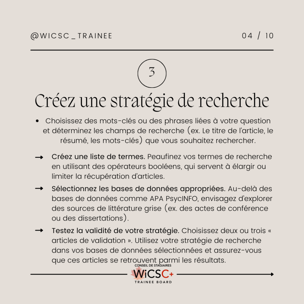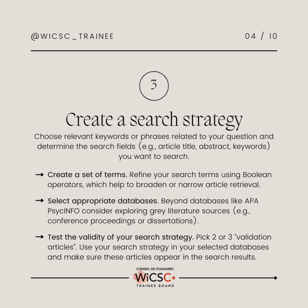 3b : Sélectionnez des bases de données appropriées alignées avec le champ de recherche. Ainsi que des bases de données comme APA PsycINFO, Web of Science, SCOPUS et CINAHL, les chercheur.euses peuvent explorer des sources de littérature grise telles que des actes de conférence ou des dissertations. Il est important d’utiliser au moins trois bases de données lors de votre étude pour effectuer une recherche exhaustive.