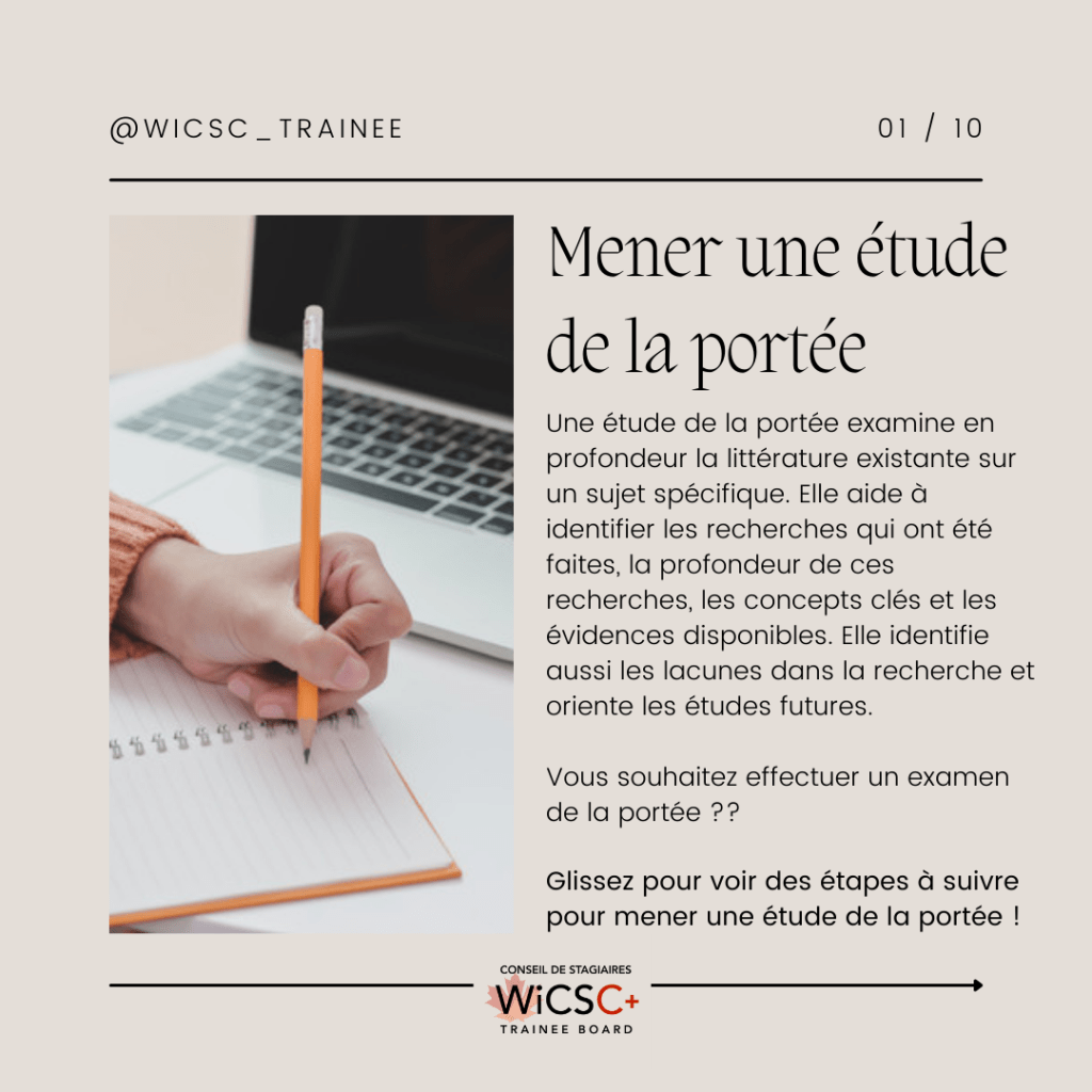 Une étude de la portée est une analyse exhaustive de la littérature existante sur un sujet spécifique. Elle vise à identifier quelles recherches ont été faites sur ce sujet, la profondeur de ces recherches, les concepts clés et les évidences disponibles. Contrairement aux revues systématiques, qui se concentrent sur des questions de recherche spécifiques et sur des résultats, les études de la portée aident à clarifier l’ampleur et la profondeur du savoir existant. Elles sont particulièrement utiles pour identifier des lacunes dans la recherche, pour définir des thèmes essentiels et pour établir un fondement pour des études futures ou des revues plus concentrées.