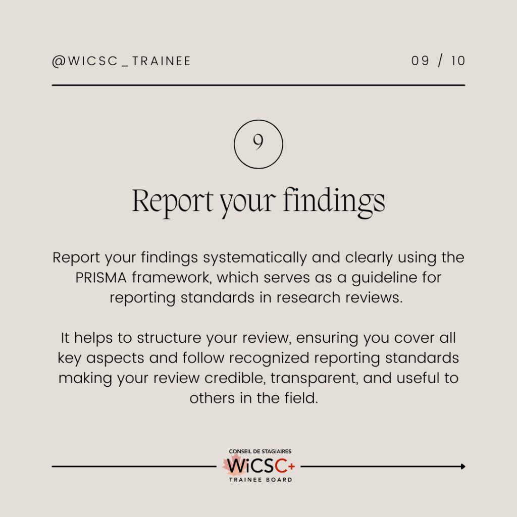 Report your findings systematically and clearly using the PRISMA framework, which serves as a guideline for reporting standards in research reviews. It helps to structure your review, ensuring you cover all key aspects and follow recognized reporting standards making your review credible, transparent, and useful to others in the field.