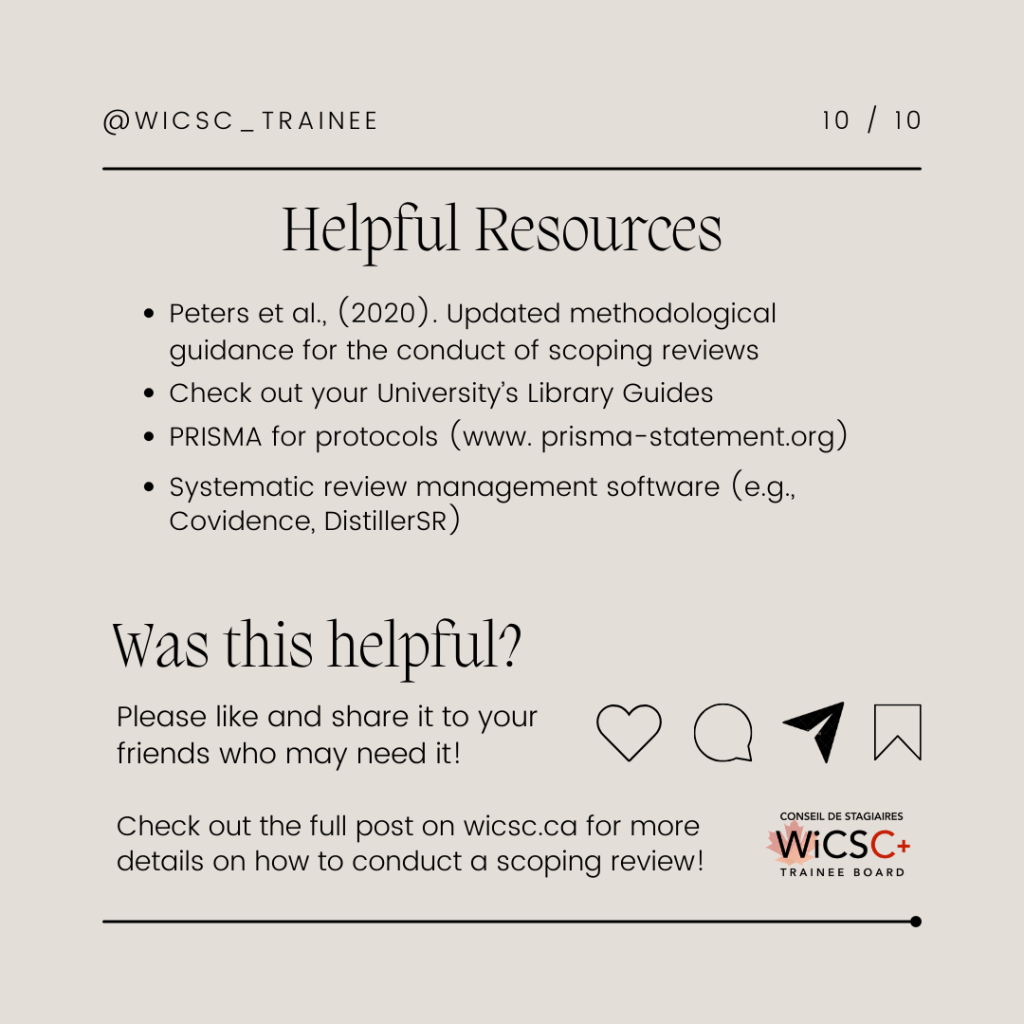 - Peters, M. D. J., Marnie, C., Tricco, A. C., Pollock, D., Munn, Z., Alexander, L., McInerney, P., Godfrey, C. M., & Khalil, H. (2020). Updated methodological guidance for the conduct of scoping reviews. JBI Evidence Synthesis, 18(10), 2119–2126. https://doi.org/10.11124/JBIES-20-00167
