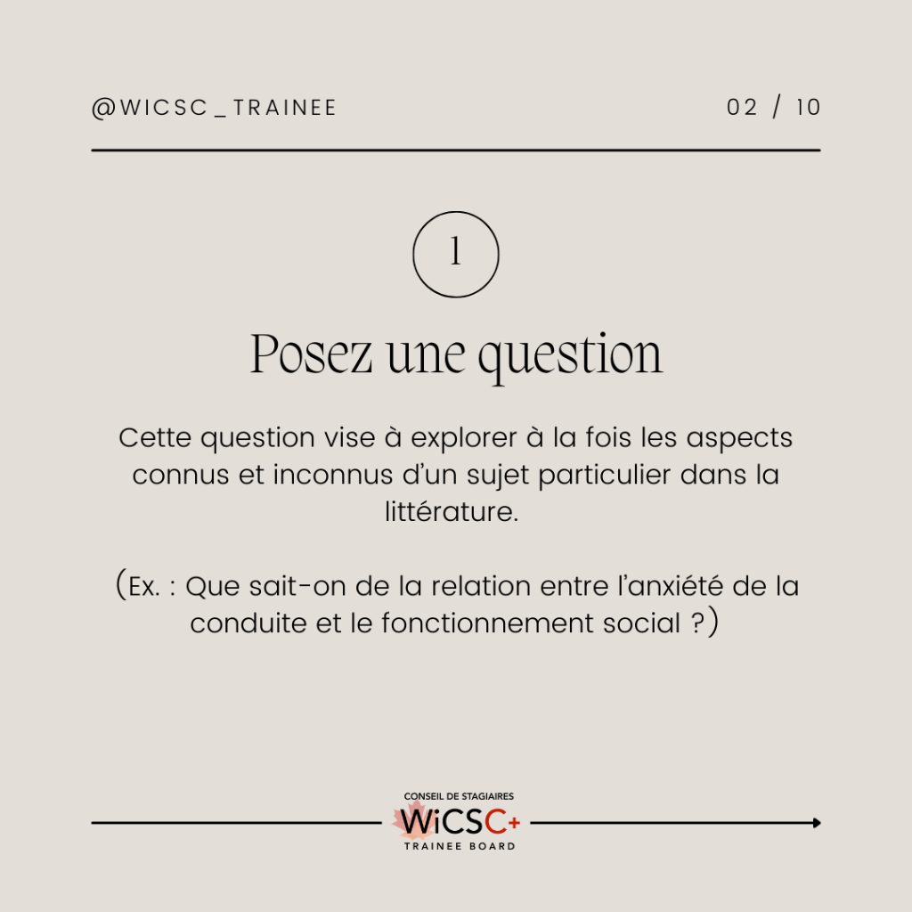 Formulez une question de recherche focalisée qui fera progresser l’étude. Cette question vise à explorer à la fois les aspects connus et inconnus d’un sujet particulier dans la littérature. Certains exemples sont les suivants : la créativité et l’inventivité sont-elles mesurées de la même façon ? Que sait-on de la relation entre l’anxiété de la conduite et le fonctionnement social ? Comment l’IA est-elle utilisée professionnellement par les chercheur.euses ?