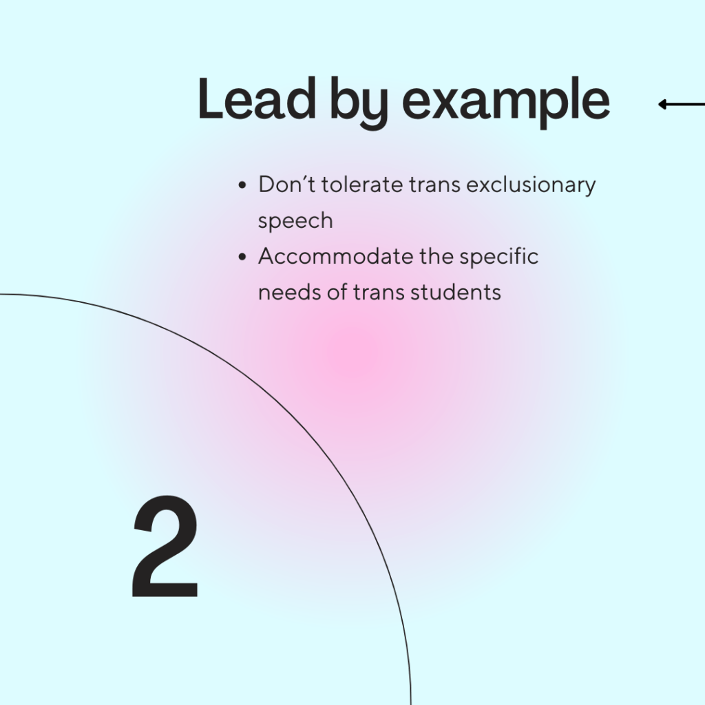 - Be attentive to the trans experience in both admin-facing and student-facing realms