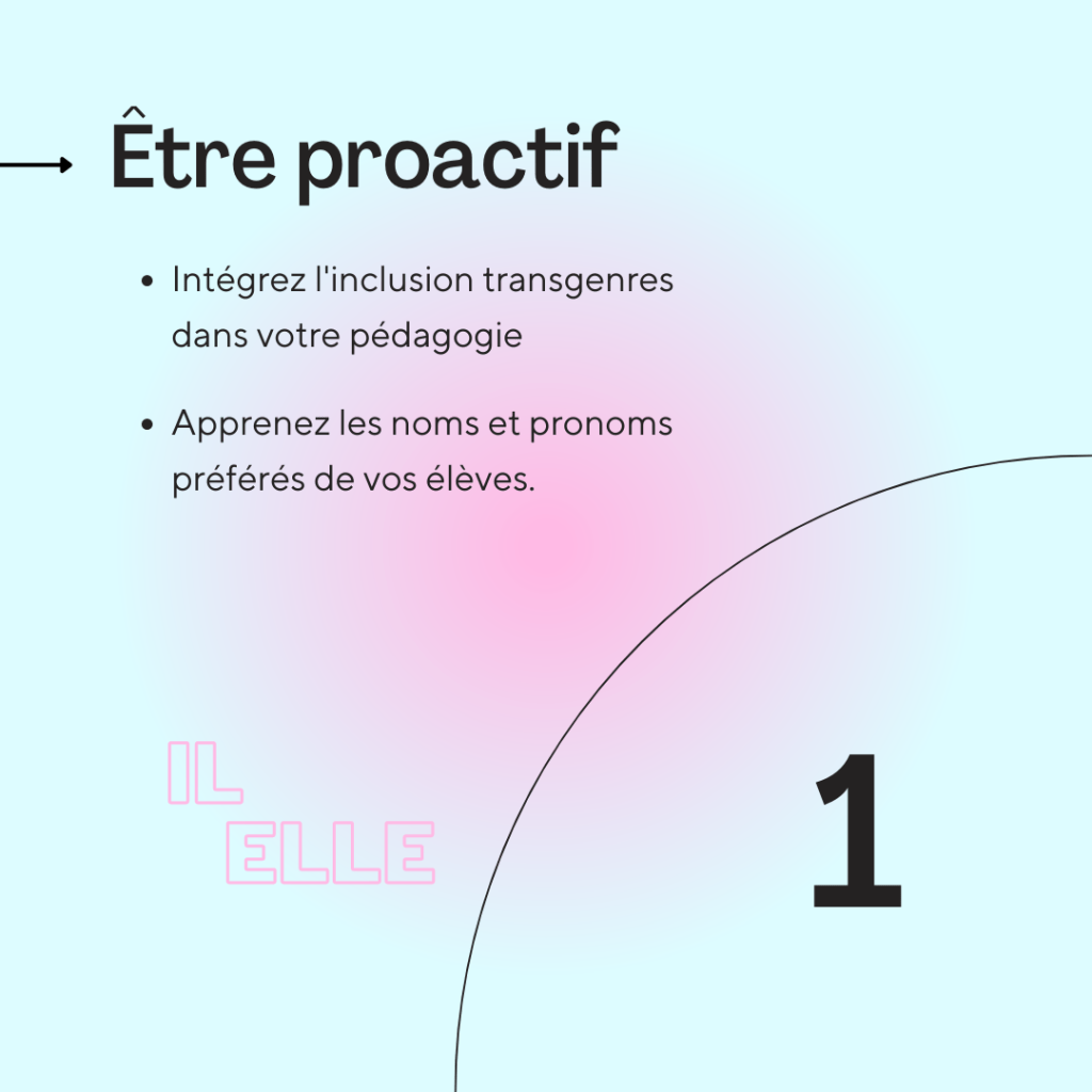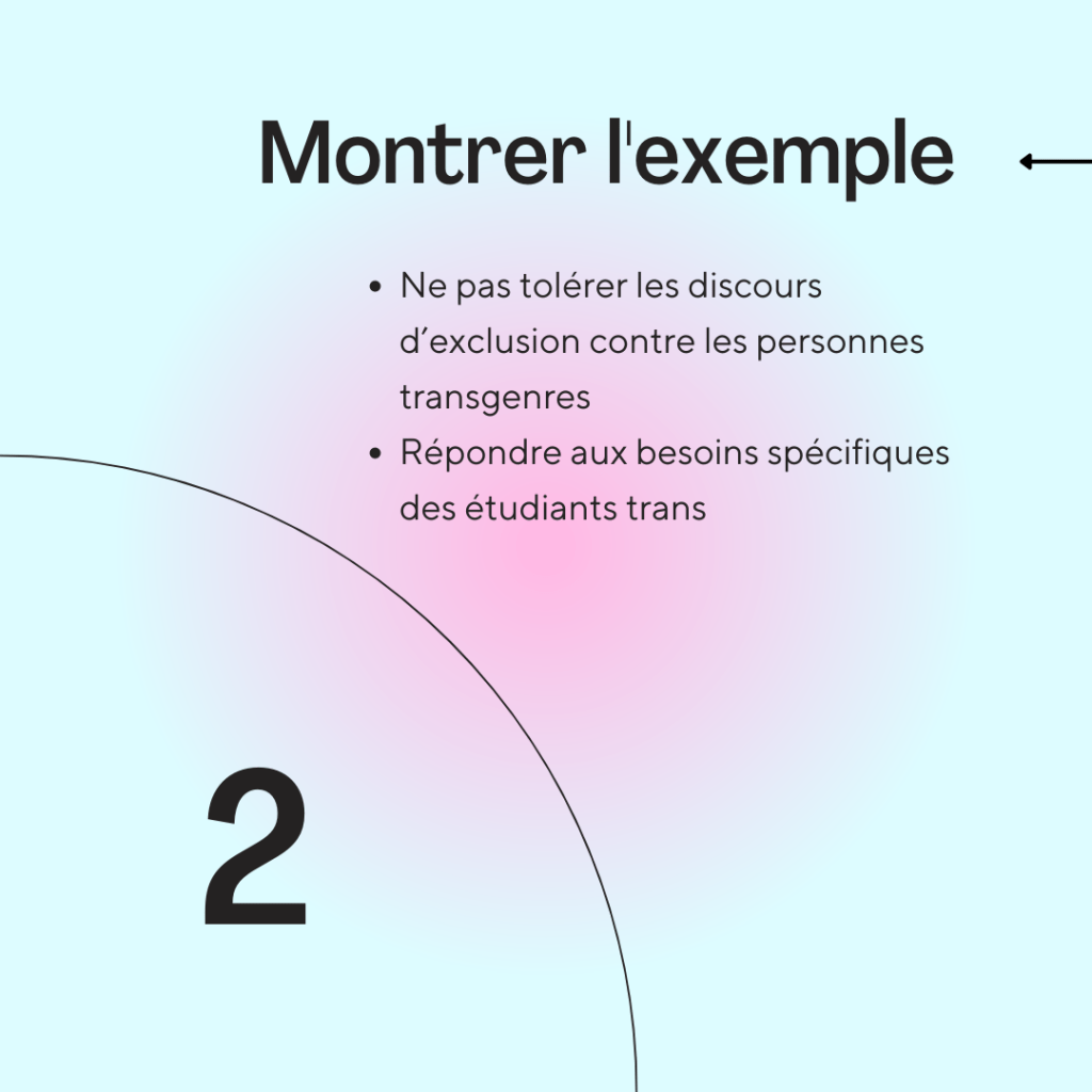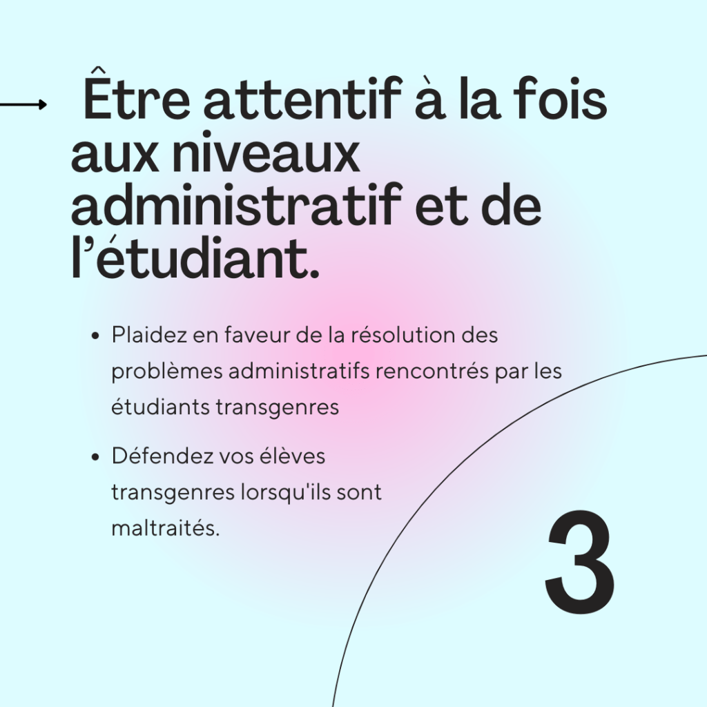 - Être attentif à l’expérience trans, tant au niveau administratif qu’au niveau de l’étudiant.