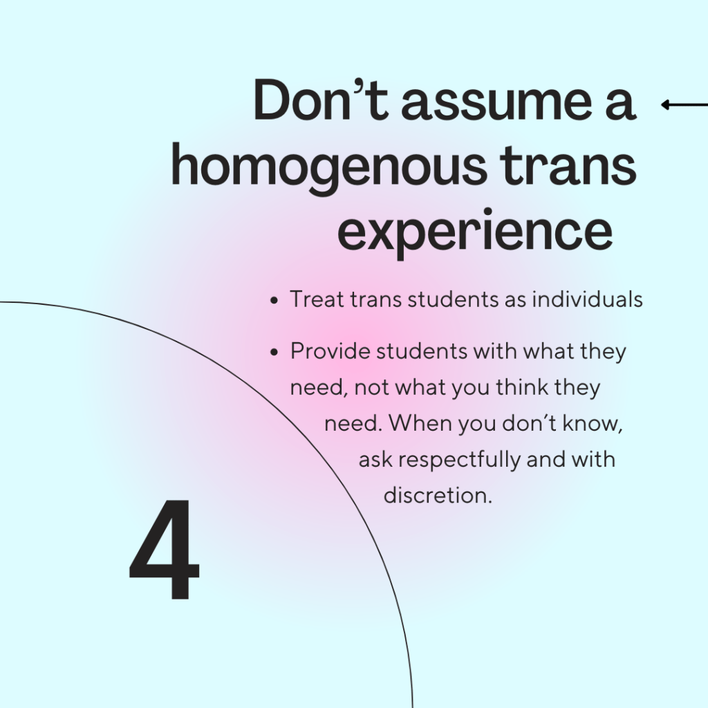 - Don’t assume a homogenous trans experience