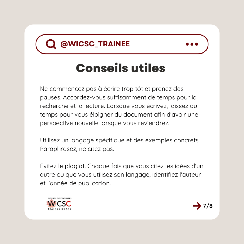 Ne commencez pas à écrire trop tôt et prenez des pauses. Accordez-vous suffisamment de temps pour la recherche et la lecture. Lorsque vous écrivez, laissez du temps pour vous éloigner du document afin d’avoir une perspective nouvelle lorsque vous reviendrez.