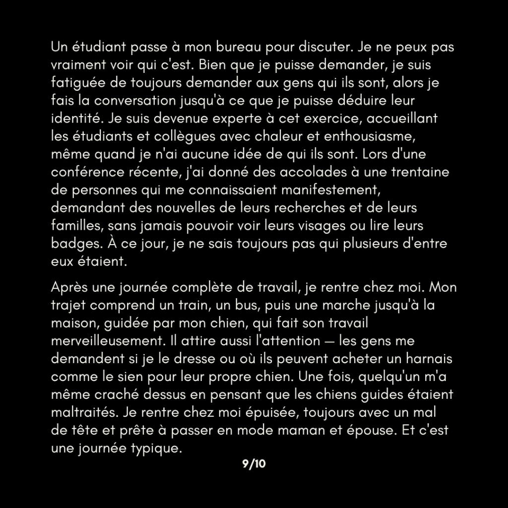 Un étudiant passe à mon bureau pour discuter. Je ne peux pas vraiment voir qui c’est. Bien que je puisse demander, je suis fatiguée de toujours demander aux gens qui ils sont, alors je fais la conversation jusqu’à ce que je puisse déduire leur identité. Je suis devenue experte à cet exercice, accueillant les étudiants et collègues avec chaleur et enthousiasme, même quand je n’ai aucune idée de qui ils sont. Lors d’une conférence récente, j’ai fait la bise àune trentaine de personnes qui me connaissaient manifestement, demandant des nouvelles de leurs recherches et de leurs familles, sans jamais pouvoir voir leurs visages ou lire leurs badges. À ce jour, je ne sais toujours pas qui plusieurs d’entre eux étaient.