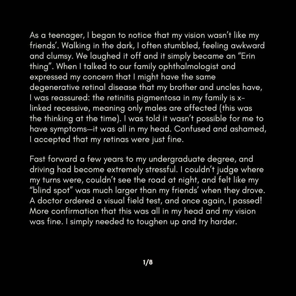 As a teenager, I began to notice that my vision wasn’t like my friends’. Walking in the dark, I often stumbled, feeling awkward and clumsy. We laughed it off and it simply became an “Erin thing”. When I talked to our family ophthalmologist and expressed my concern that I might have the same degenerative retinal disease that my brother and uncles have, I was reassured: the retinitis pigmentosa in my family is x-linked recessive, meaning only males are affected (this was the thinking at the time). I was told it wasn’t possible for me to have symptoms—it was all in my head. Confused and ashamed, I accepted that my retinas were just fine.