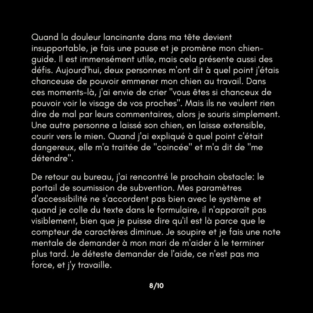 De retour au bureau, j’ai rencontré le prochain obstacle: le portail de soumission de subvention. Mes paramètres d’accessibilité ne s’accordent pas bien avec le système et quand je colle du texte dans le formulaire, il n’apparaît pas visiblement, bien que je puisse dire qu’il est là parce que le compteur de caractères diminue. Je soupire et je fais une note mentale de demander à mon mari de m’aider à le terminer plus tard. Je déteste demander de l’aide, ce n’est pas ma force, et j’y travaille.