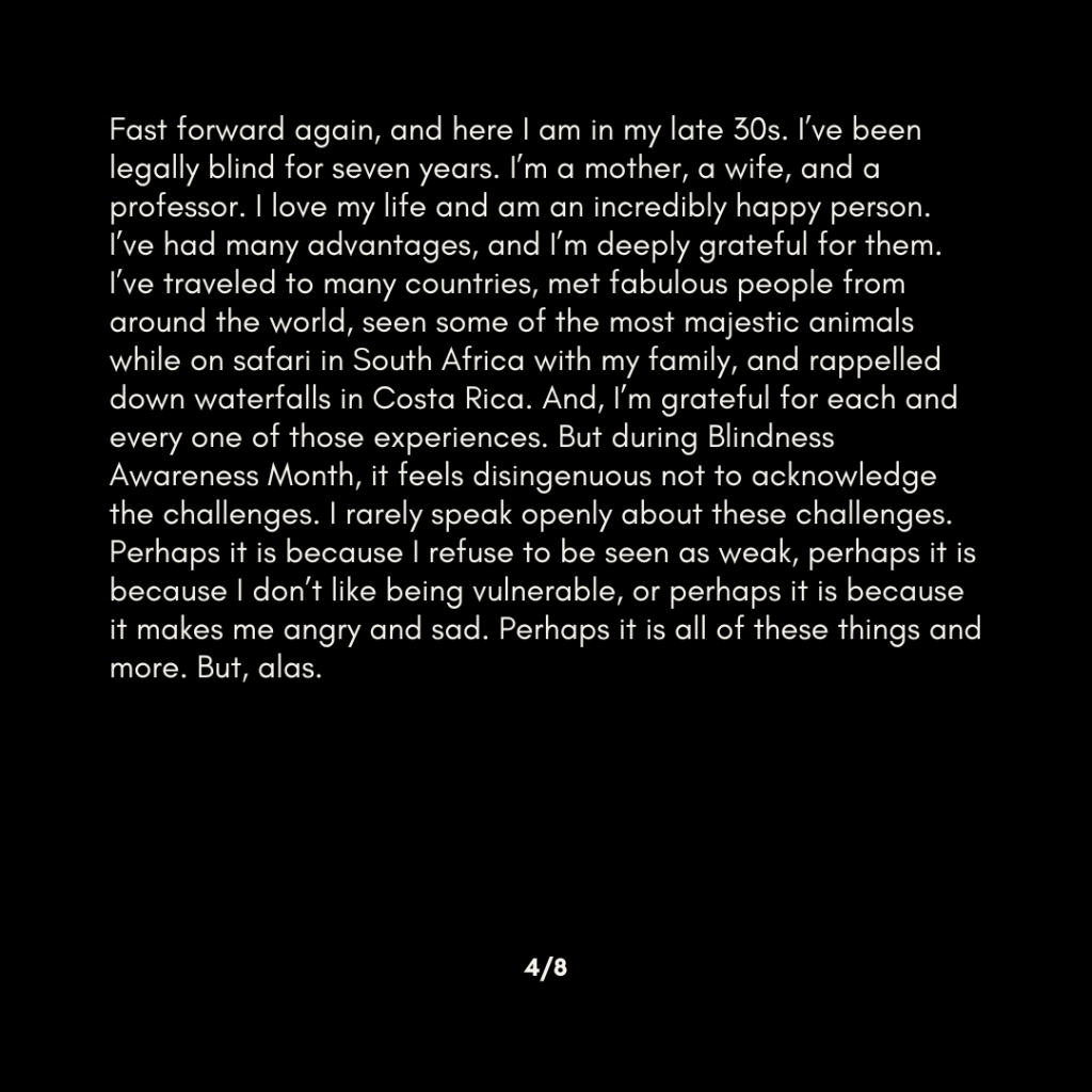 Fast forward again, and here I am in my late 30s. I’ve been legally blind for seven years. I’m a mother, a wife, and a professor. I love my life and am an incredibly happy person. I’ve had many advantages, and I’m deeply grateful for them. I’ve traveled to many countries, met fabulous people from around the world, seen some of the most majestic animals while on safari in South Africa with my family, and rappelled down waterfalls in Costa Rica. And, I’m grateful for each and every one of those experiences. But during Blindness Awareness Month, it feels disingenuous not to acknowledge the challenges. I rarely speak openly about these challenges. Perhaps it is because I refuse to be seen as weak, perhaps it is because I don’t like being vulnerable, or perhaps it is because it makes me angry and sad. Perhaps it is all of these things and more. But, alas.