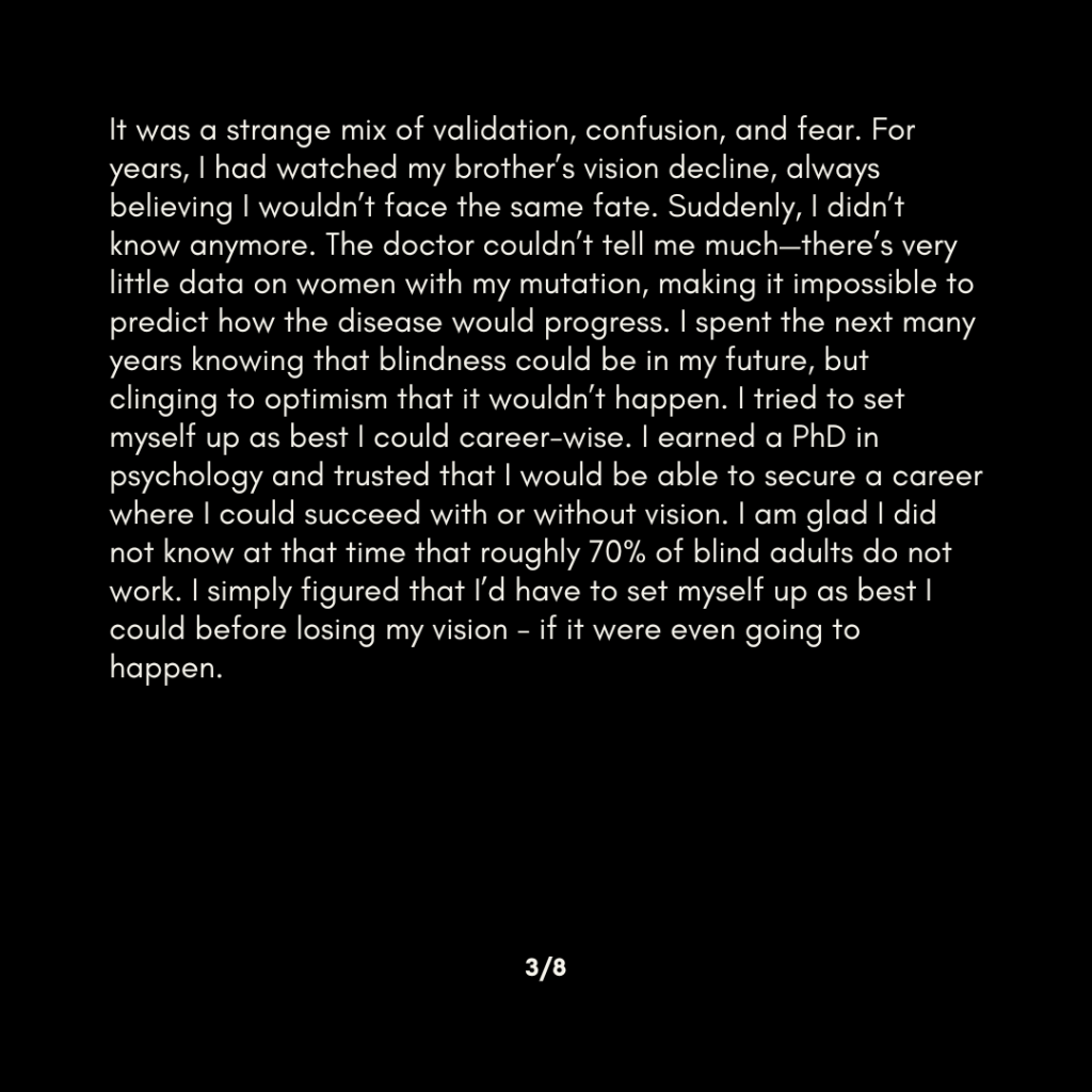 It was a strange mix of validation, confusion, and fear. For years, I had watched my brother’s vision decline, always believing I wouldn’t face the same fate. Suddenly, I didn’t know anymore. The doctor couldn’t tell me much—there’s very little data on women with my mutation, making it impossible to predict how the disease would progress. I spent the next many years knowing that blindness could be in my future, but clinging to optimism that it wouldn’t happen. I tried to set myself up as best I could career-wise. I earned a PhD in psychology and trusted that I would be able to secure a career where I could succeed with or without vision. I am glad I did not know at that time that roughly 70% of blind adults do not work. I simply figured that I’d have to set myself up as best I could before losing my vision – if it were even going to happen.