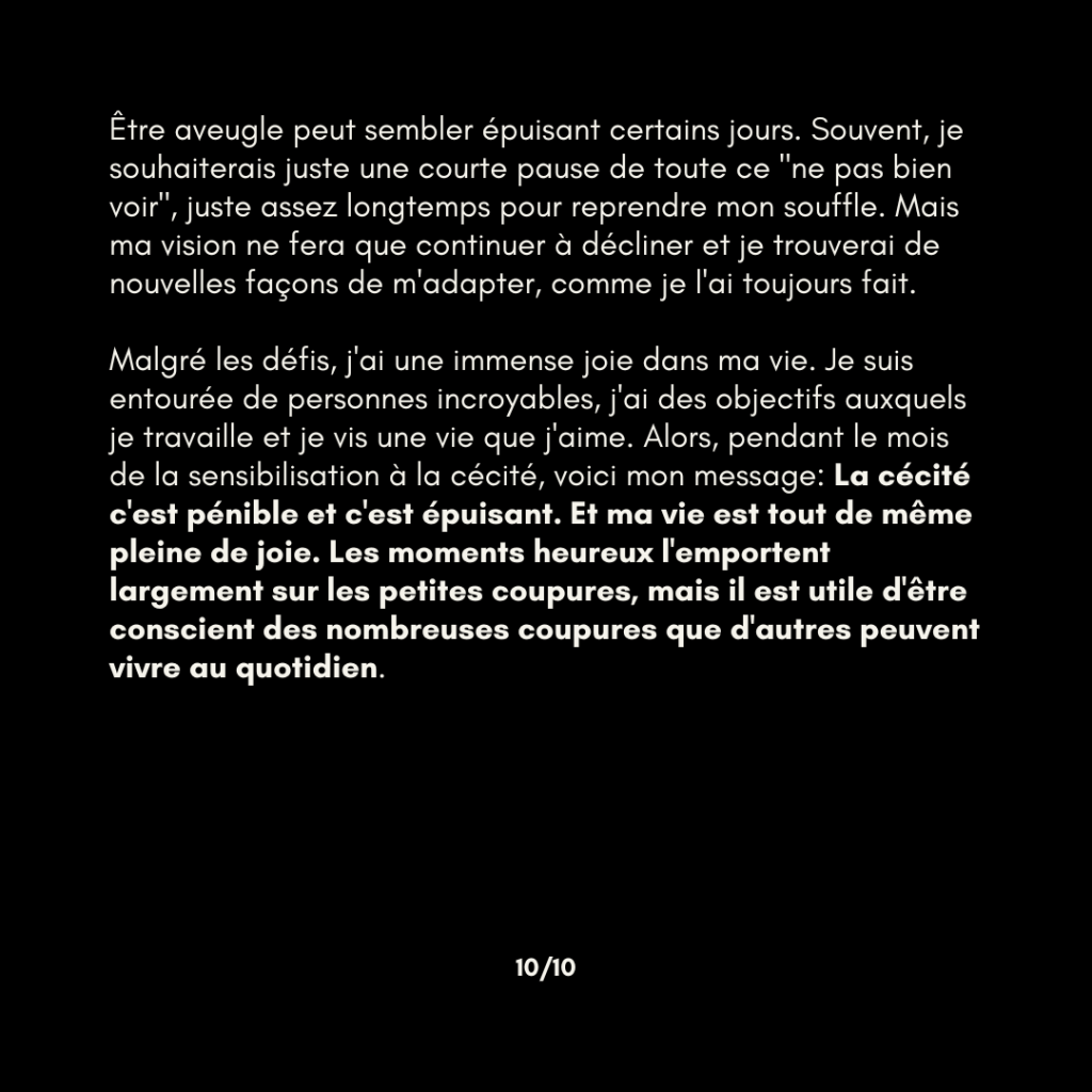Malgré les défis, j’ai une immense joie dans ma vie. Je suis entourée de personnes incroyables, j’ai des objectifs auxquels je travaille et je vis une vie que j’aime. Alors, pendant le Mois de la sensibilisation à la cécité, voici mon message: La cécité, c’est pénible, et c’est épuisant. Et ma vie est tout de même pleine de joie. Les moments heureux l’emportent largement sur les petites coupures, mais il est utile d’être conscient des nombreuses coupures que d’autres peuvent vivre au quotidien.