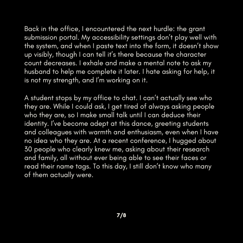 Back in the office, I encountered the next hurdle: the grant submission portal. My accessibility settings don’t play well with the system, and when I paste text into the form, it doesn’t show up visibly, though I can tell it’s there because the character count decreases. I exhale and make a mental note to ask my husband to help me complete it later. I hate asking for help, it is not my strength, and I’m working on it.