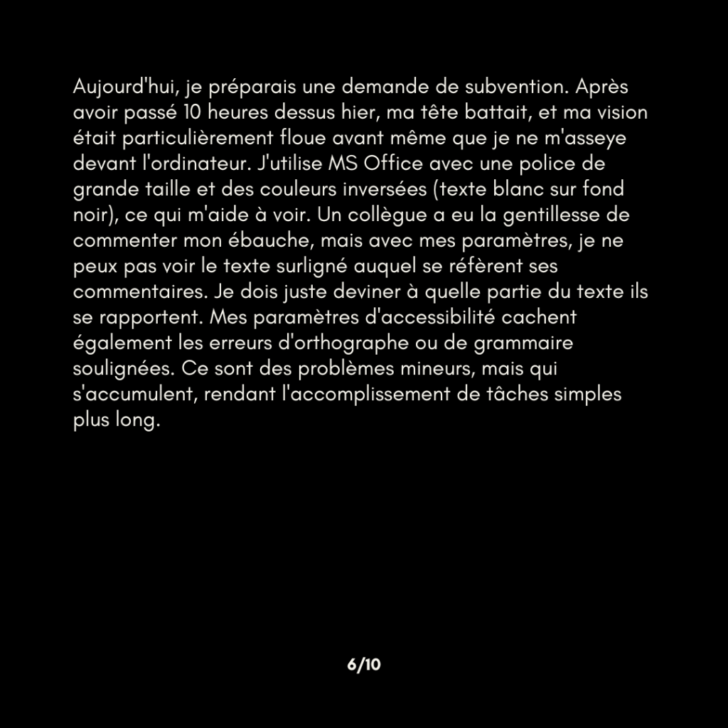 Aujourd’hui, je préparais une demande de subvention. Après avoir passé 10 heures dessus hier, ma tête battait, et ma vision était particulièrement floue avant même que je ne m’asseye devant l’ordinateur. J’utilise MS Office avec une police de grande taille et des couleurs inversées (texte blanc sur fond noir), ce qui m’aide à voir. Un collègue a eu la gentillesse de commenter mon ébauche, mais avec mes paramètres, je ne peux pas voir le texte surligné auquel se réfèrent ses commentaires. Je dois juste deviner à quelle partie du texte ils se rapportent. Mes paramètres d’accessibilité cachent également les erreurs d’orthographe ou de grammaire soulignées. Ce sont des problèmes mineurs, mais qui s’accumulent, rendant l’accomplissement de tâches simples plus long.