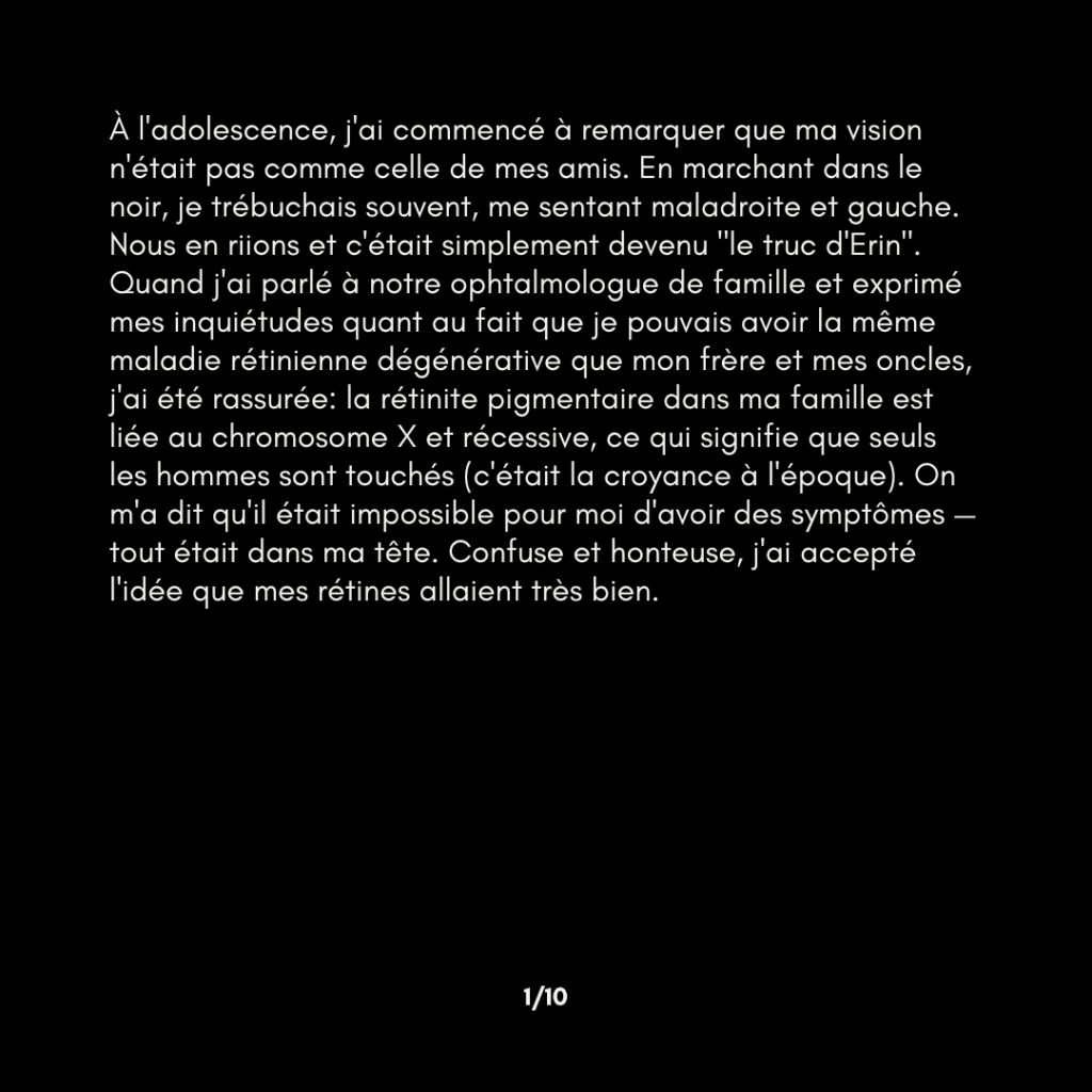 À l’adolescence, j’ai commencé à remarquer que ma vision n’était pas comme celle de mes amis. En marchant dans le noir, je trébuchais souvent, me sentant maladroite et gauche. Nous en riions et c’était simplement devenu “le truc d’Erin”. Quand j’ai parlé à notre ophtalmologue de famille et exprimé mes inquiétudes quant au fait que je pouvais avoir la même maladie rétinienne dégénérative que mon frère et mes oncles, j’ai été rassurée: la rétinite pigmentaire dans ma famille est liée au chromosome X et récessive, ce qui signifie que seuls les hommes sont touchés (c’était la croyance à l’époque). On m’a dit qu’il était impossible pour moi d’avoir des symptômes — tout était dans ma tête. Confuse et honteuse, j’ai accepté l’idée que mes rétines allaient très bien.