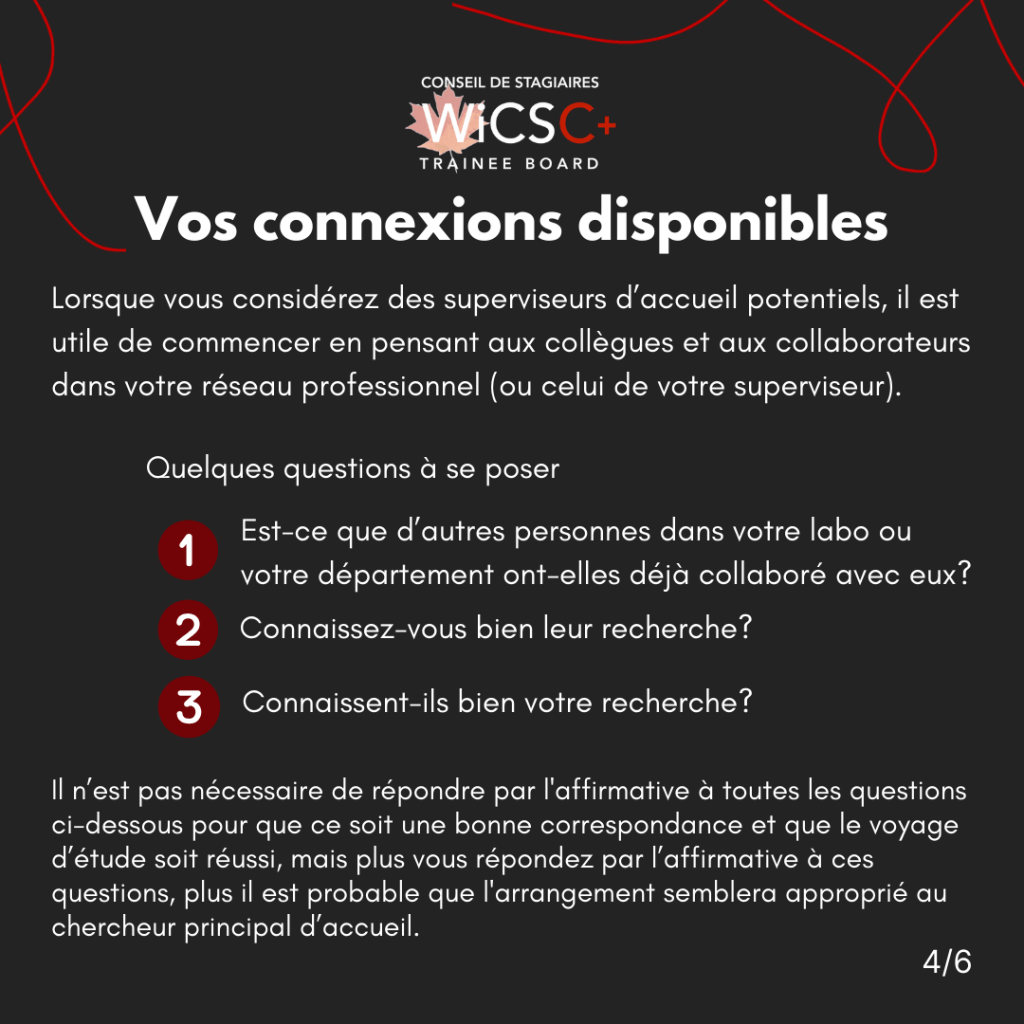 Il n’est pas nécessaire de répondre par l’affirmative à toutes les questions ci-dessous pour que ce soit une bonne correspondance et que le voyage d’étude soit réussi, mais plus vous répondez par l’affirmative à ces questions, plus il est probable que l’arrangement semblera approprié au chercheur principal d’accueil.