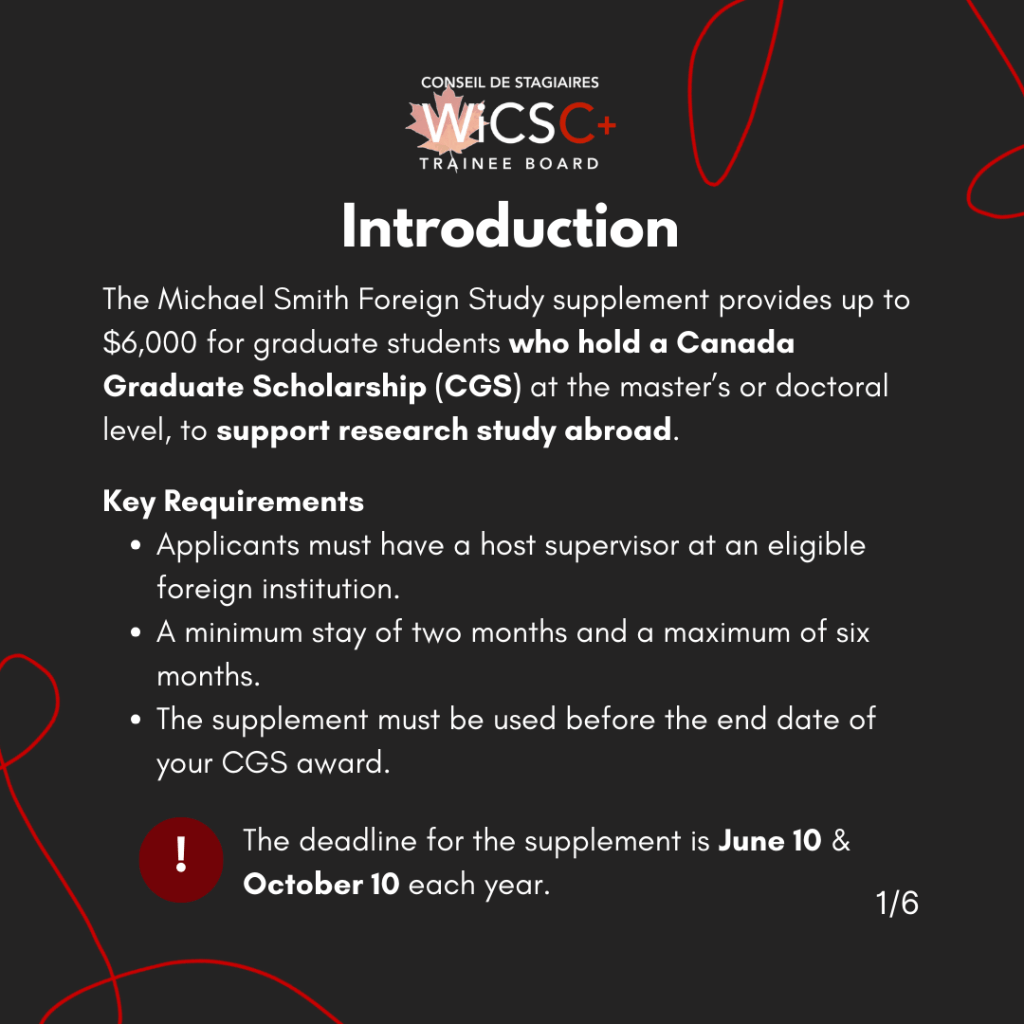 Canada Graduate Scholarship – Michael Smith Foreign Study Supplement (CGS-MSFSS; 2-6 months, up to CAD $6000)