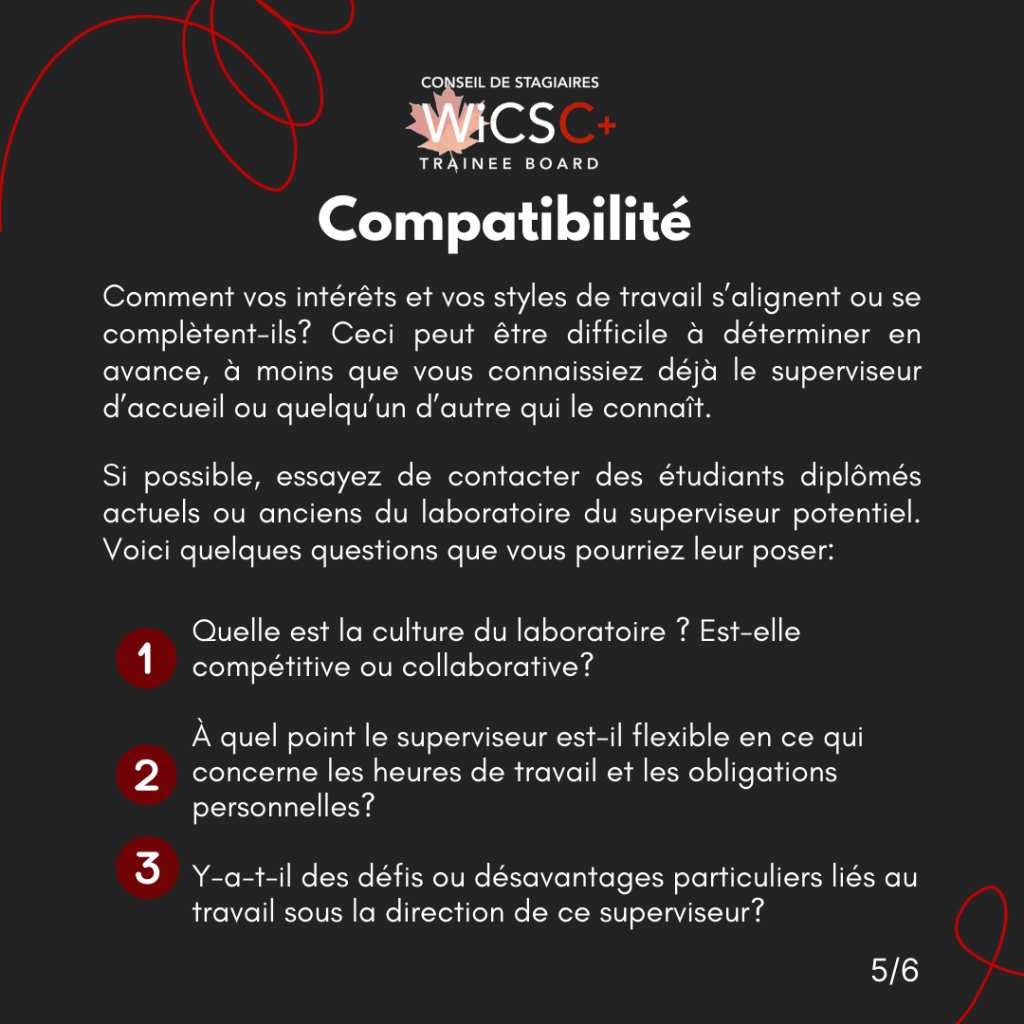 Comment vos intérêts et vos styles de travail s’alignent ou se complètent-ils ? Ceci peut être difficile à déterminer en avance, à moins que vous connaissiez déjà le superviseur d’accueil ou quelqu’un d’autre qui le connaît.