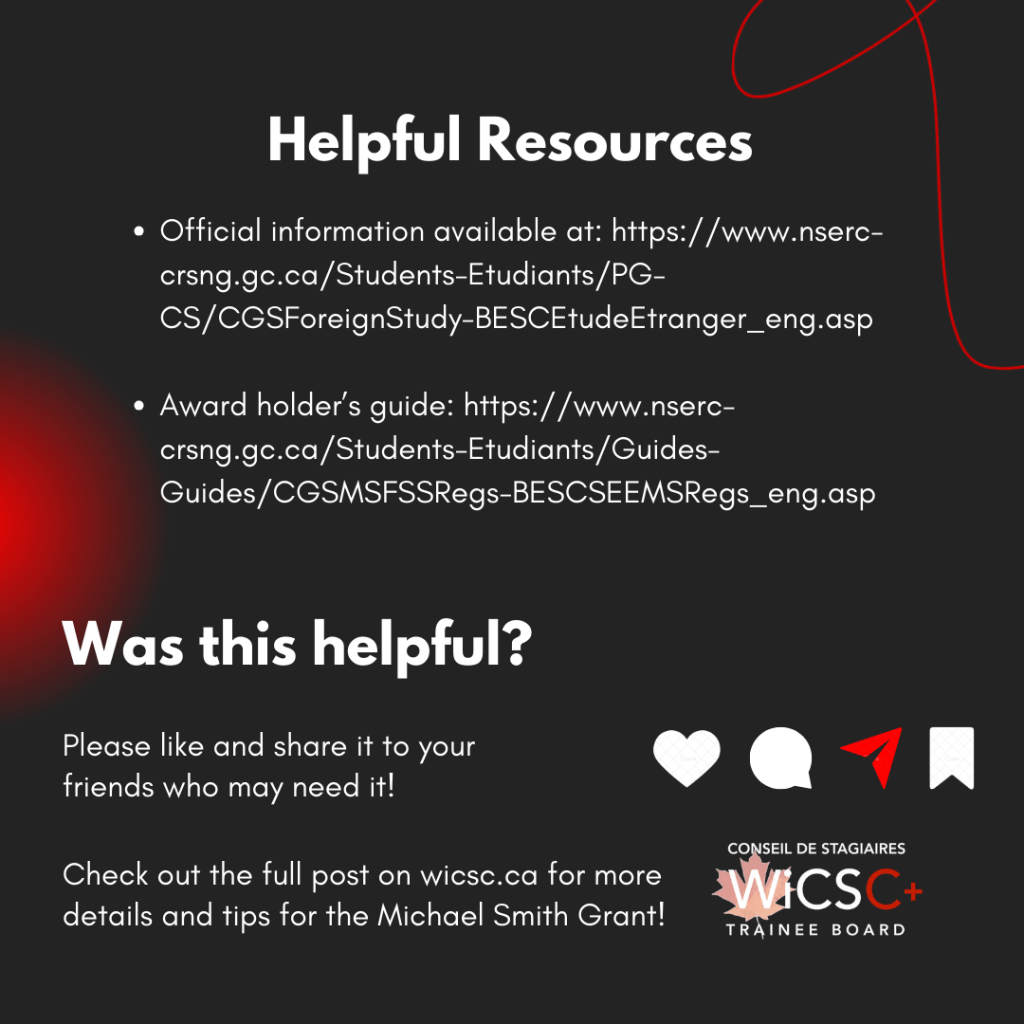Official information from NSERC regarding the supplement and application procedures is available at: https://www.nserc-crsng.gc.ca/Students-Etudiants/PG-CS/CGSForeignStudy-BESCEtudeEtranger_eng.asp