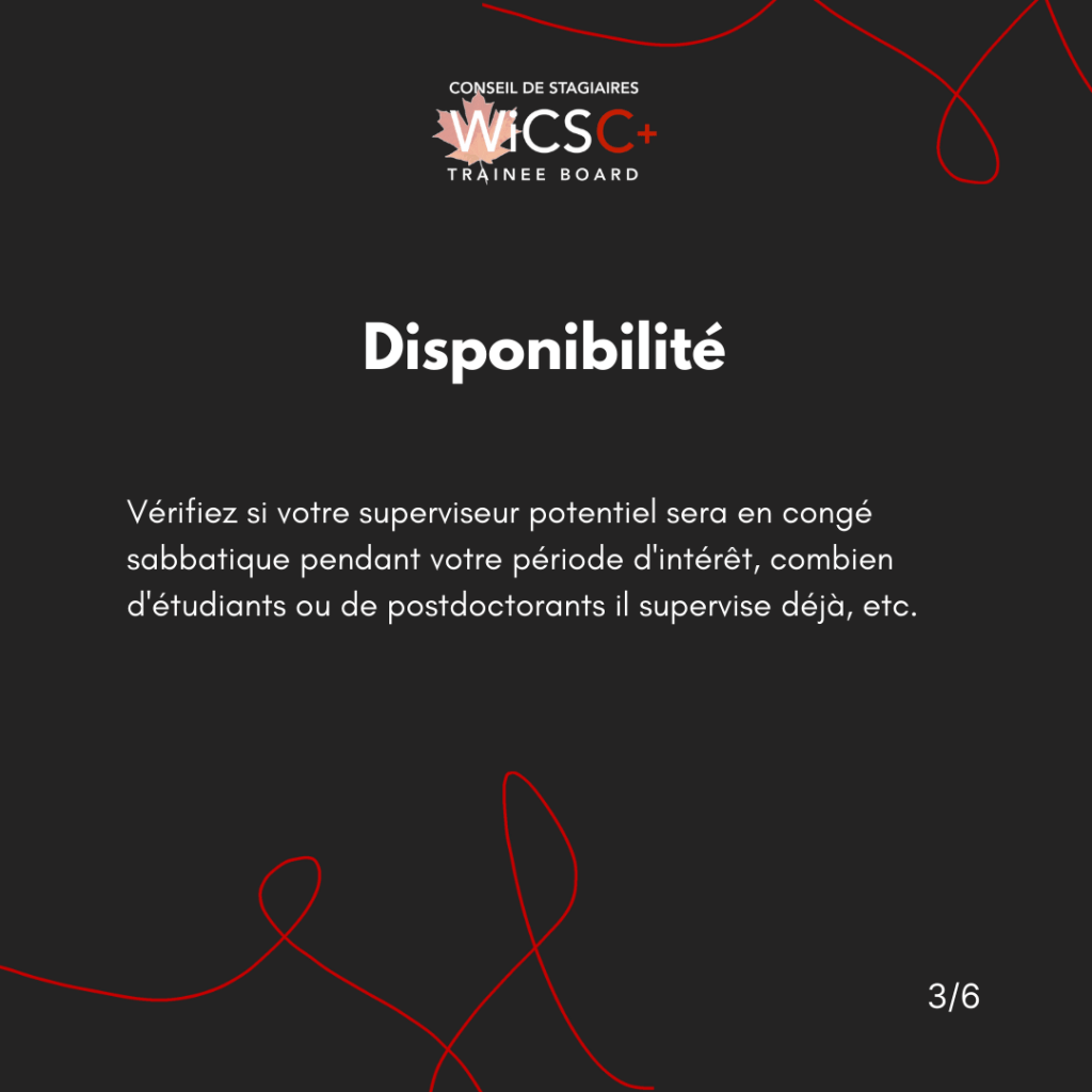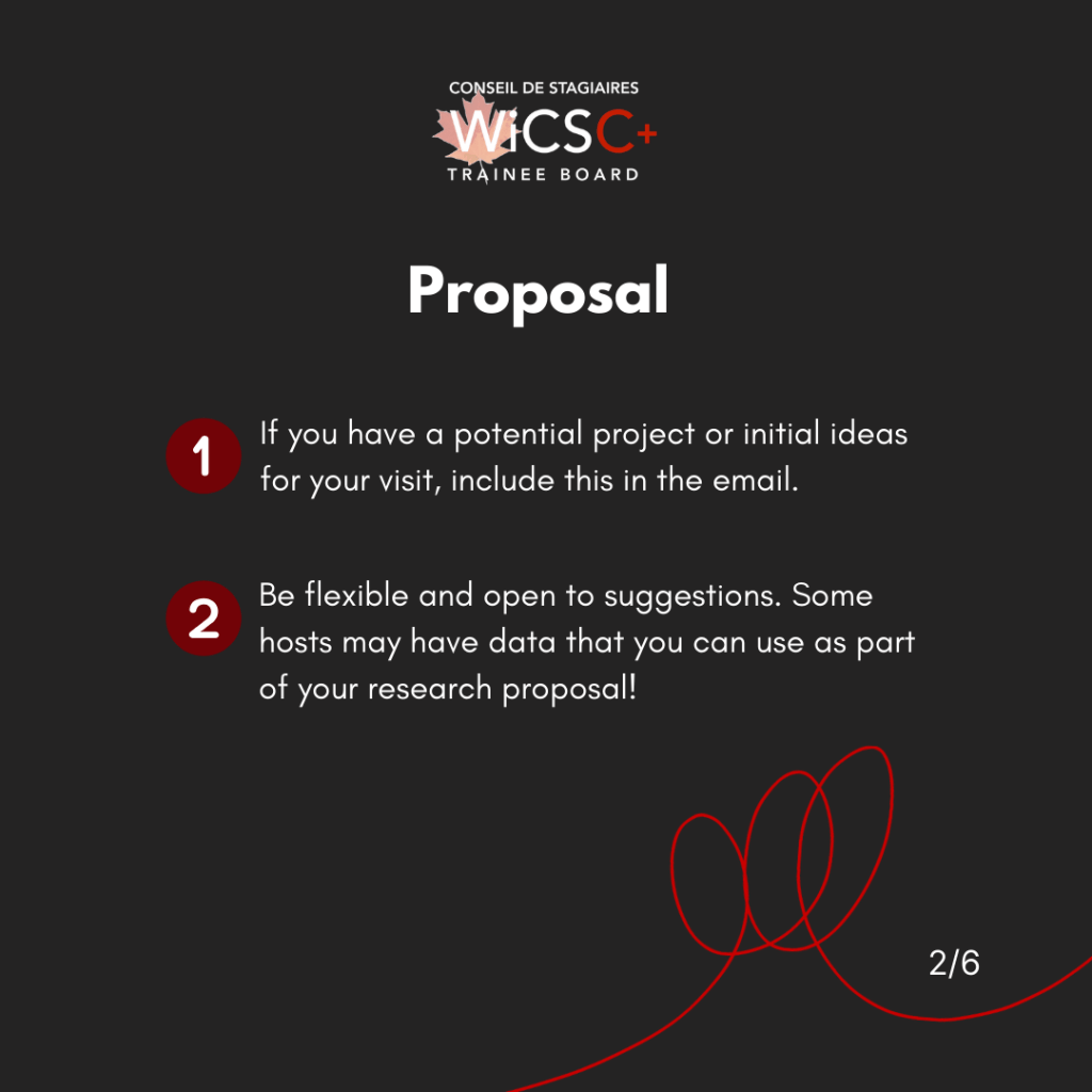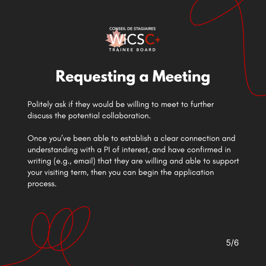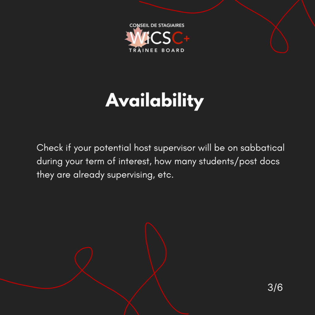 - Check if your potential host supervisor will be on sabbatical during your term of interest, how many students/post docs they are already supervising, etc.