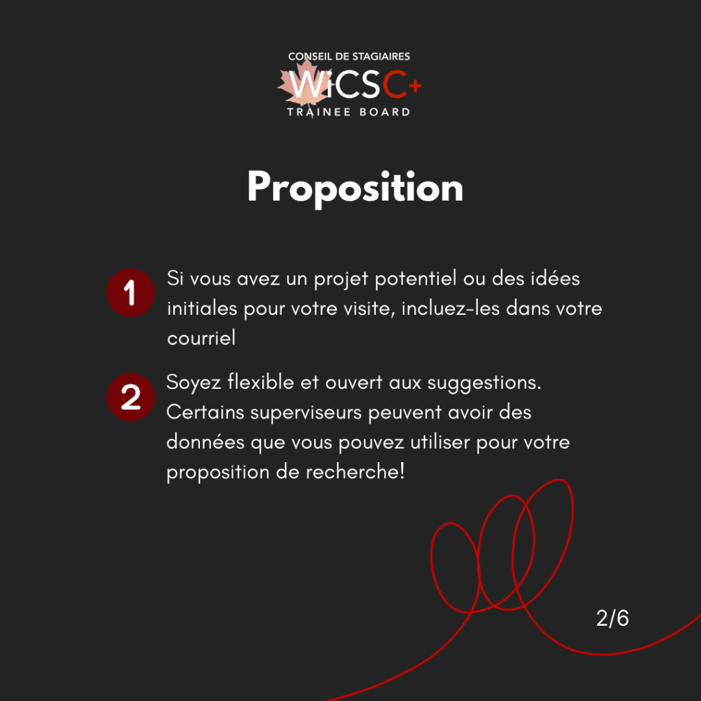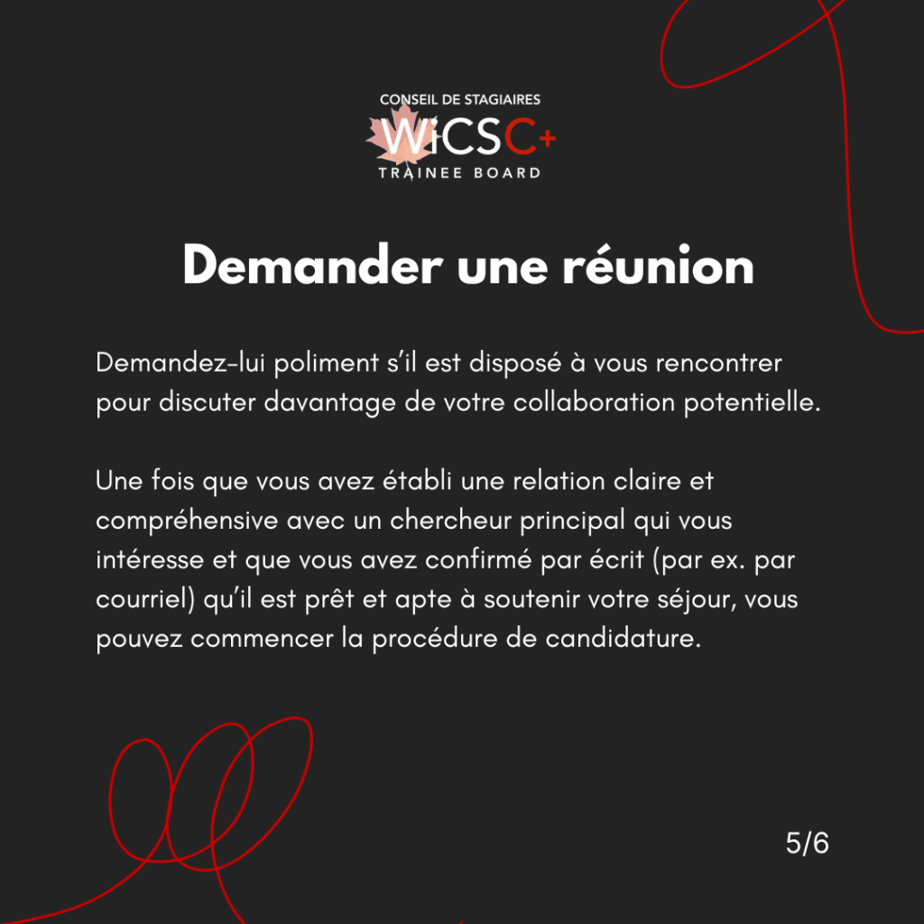 Dès que vous avez identifié des superviseurs potentiels d’après les considérations mentionnées dans « Partie 1 : Trouver un superviseur d’accueil potentiel », il est temps de prendre contact avec eux. Vous pouvez contacter votre superviseur potentiel par courriel. Par ailleurs, si vous avez des relations mutuelles ou vous connaissez quelqu’un qui a déjà travaillé avec ce superviseur d’accueil potentiel, vous pourriez lui demander de faciliter une introduction ou de vous fournir des informations supplémentaires.