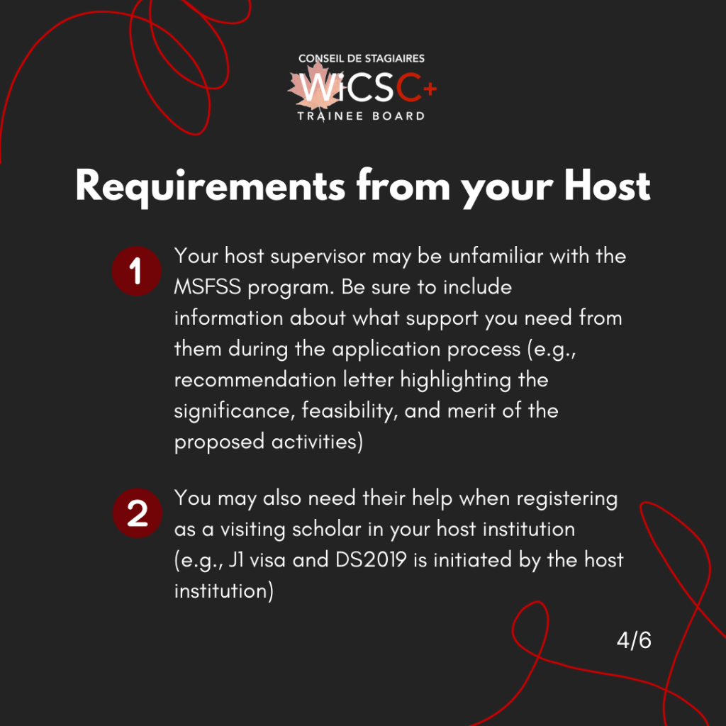 - Your host supervisor may be unfamiliar with the MSFSS program. Be sure to include information about what support you need from them during the application process (e.g., recommendation letter highlighting the significance, feasibility, and merit of the proposed activities)