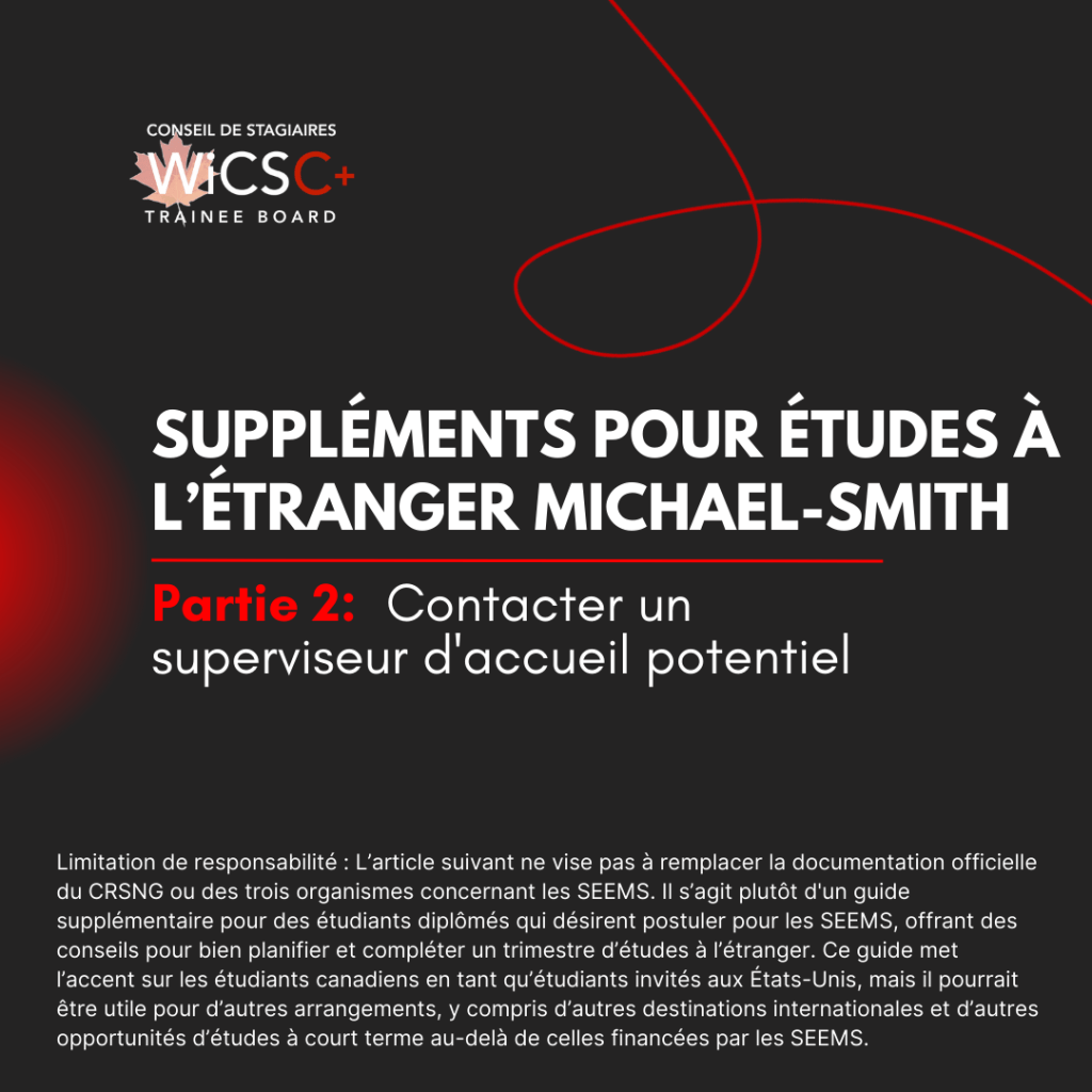 L’article suivant ne vise pas à remplacer la documentation officielle du CRSNG ou des trois organismes concernant les SEEMS. Il s’agit plutôt d’un guide supplémentaire pour des étudiants diplômés qui désirent postuler pour les SEEMS, offrant des conseils pour bien planifier et terminer un trimestre d’études à l’étranger. Ce guide met l’accent sur les étudiants canadiens en tant qu’étudiants invités aux États-Unis, mais il pourrait être utile pour d’autres arrangements, y compris d’autres destinations internationales et d’autres opportunités d’études à court terme au-delà de celles financées par les SEEMS.
